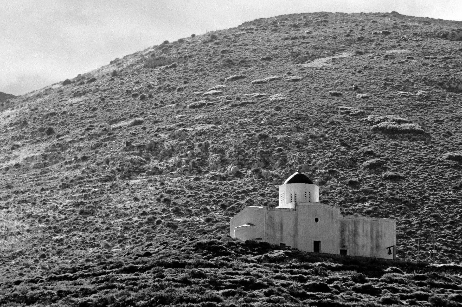 The sun can barely reach a church amongst the hills. The location of the church is above Porto Kagio, in Mani. Although it seems that I made this photo in the morning, I actually took at noon. More on that later.