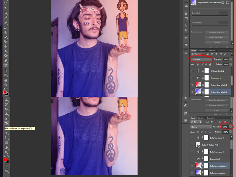 Now, following the most exciting of the edition, we can notice the subtle color that it has, the base of colors is blue and red, in quite pure and bright tones, applying gradients with angles. For blue, apply it with full opacity (100%) and in "soft light" image blending mode. Then for red with 29% opacity.