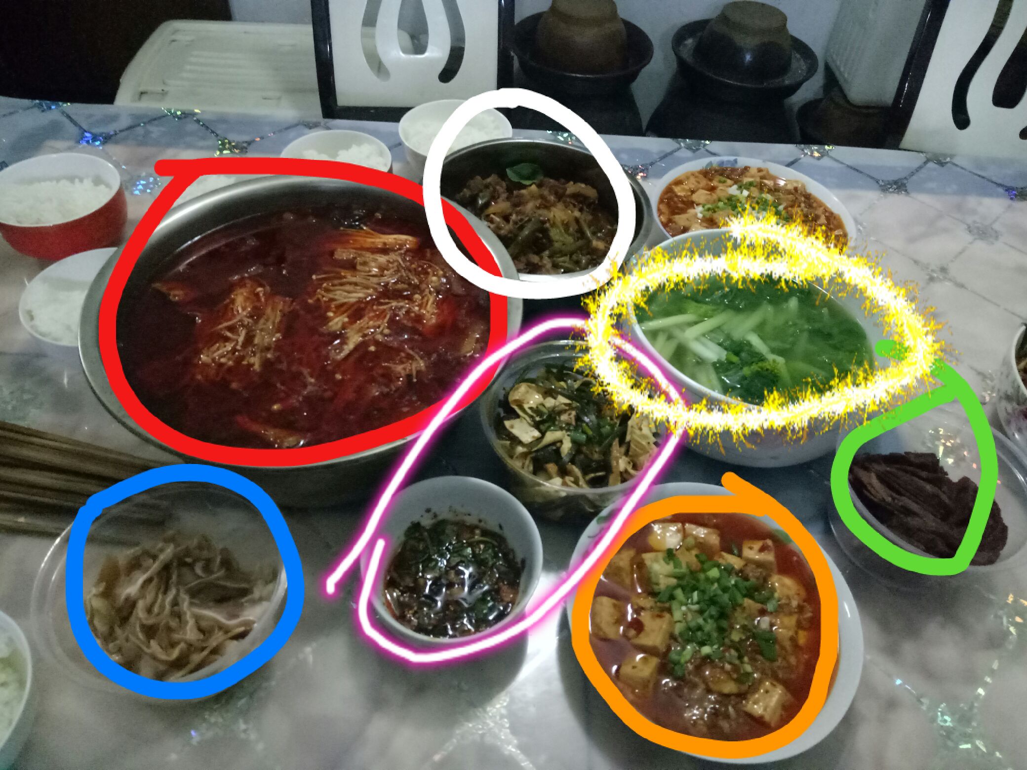 The red coil is my favorite, and it is also a famous dish in China - hot pot, orange is Mapo tofu, green is braised duck head, etc.
