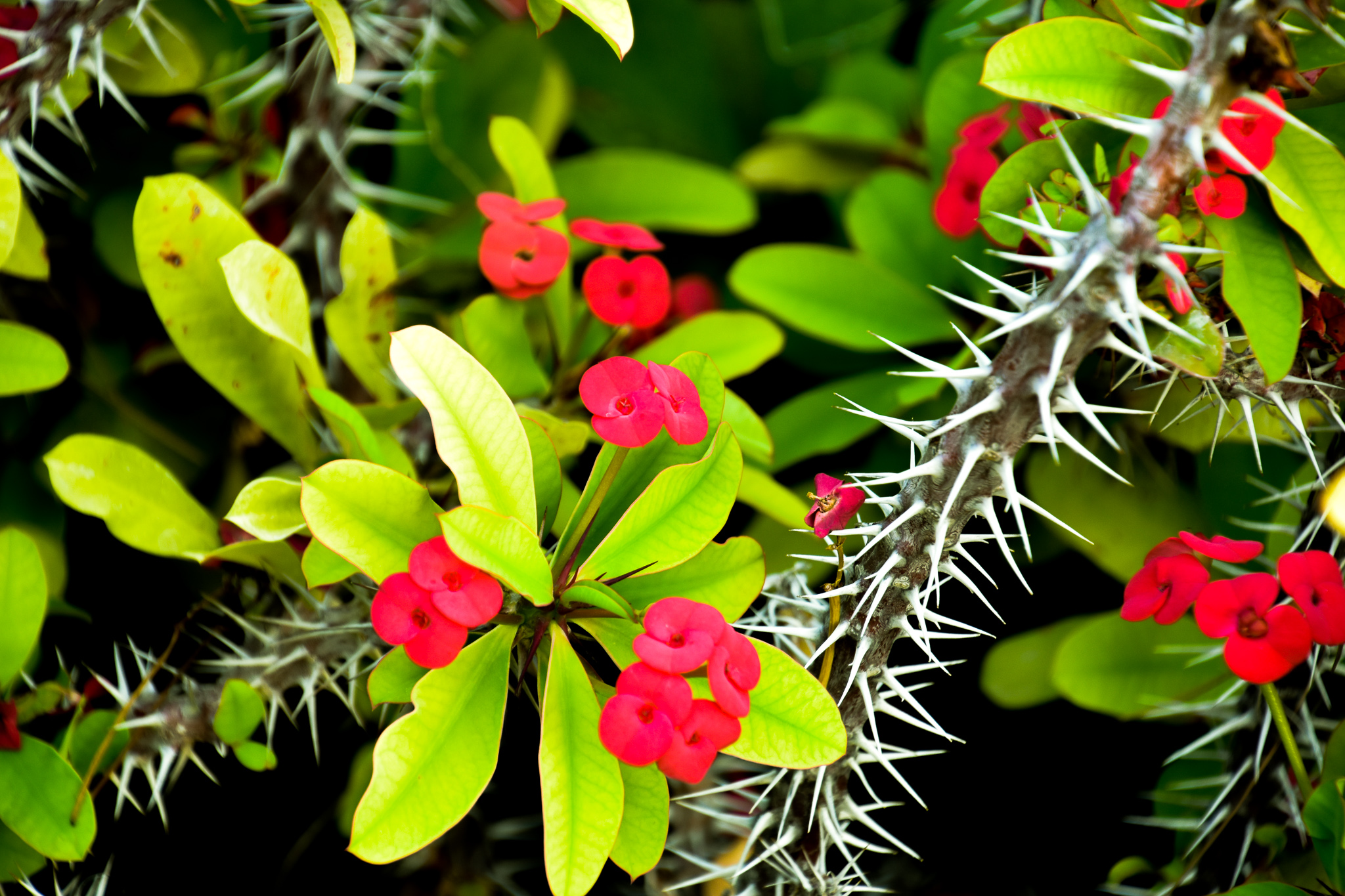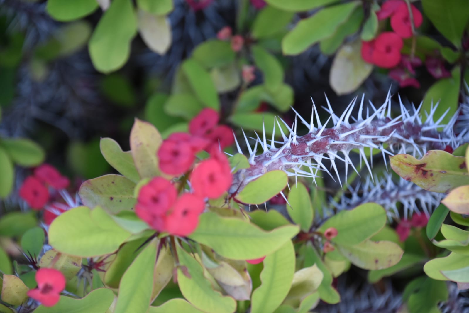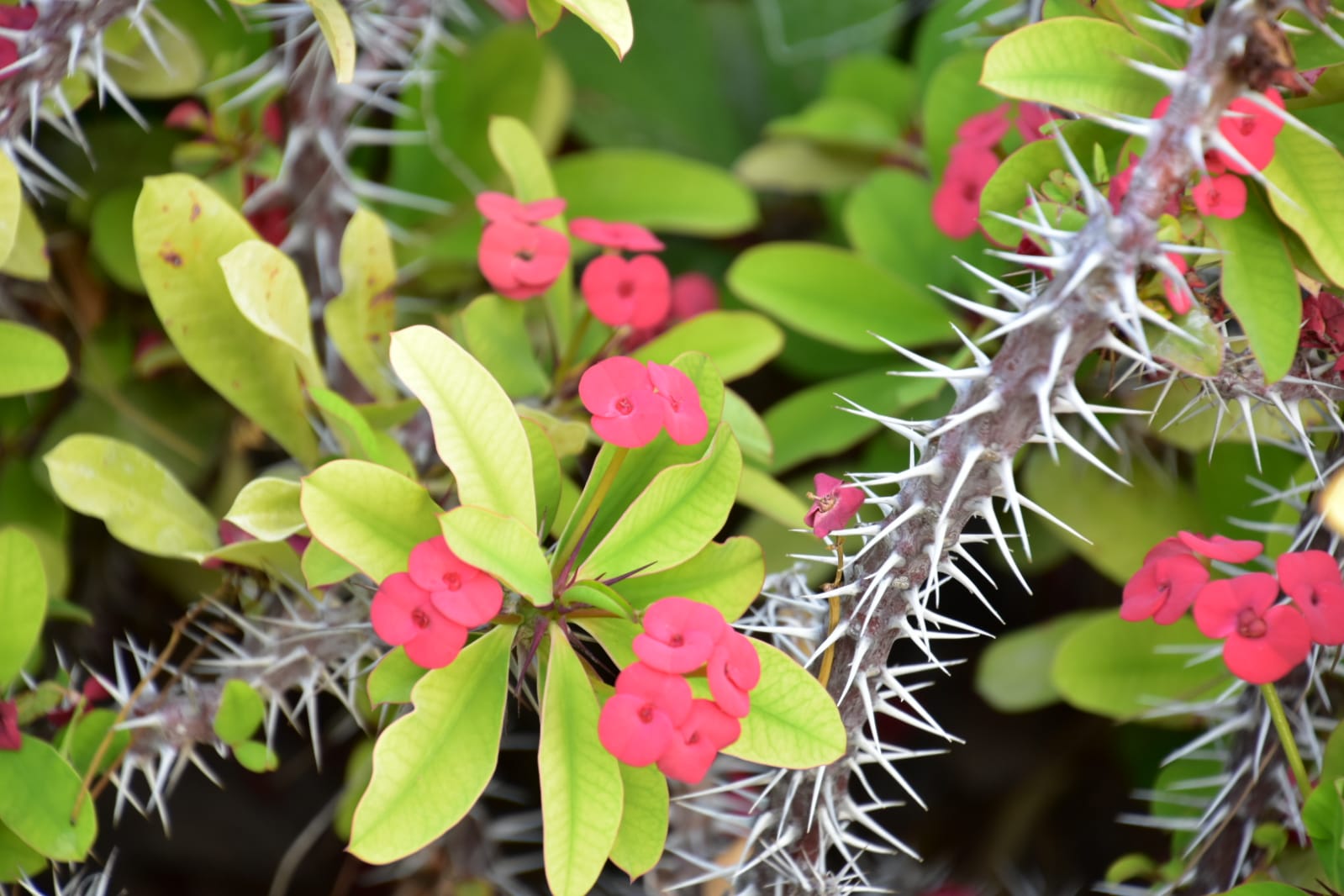 This plant is a thorny shrub, which has its origin in Madagascar, it is a very resistant plant, it needs a lot of sun, but by storing water in its stem, it does not need much irrigation. What we can think of as flowers are not are actually really bracts, which can be red, white or pink, the flowers are very tiny and are inside the bracts, (the leaves that accompany the flowers).