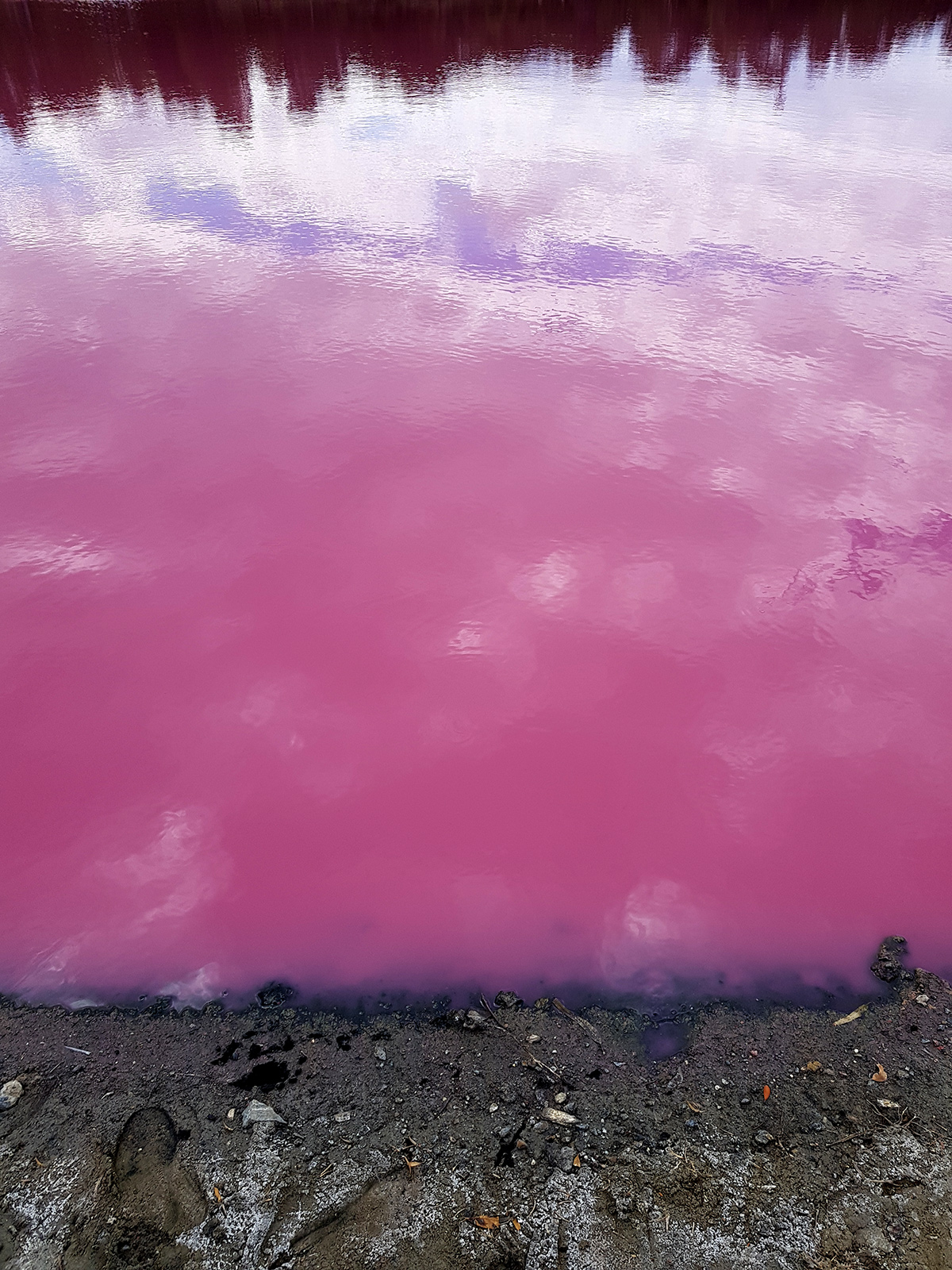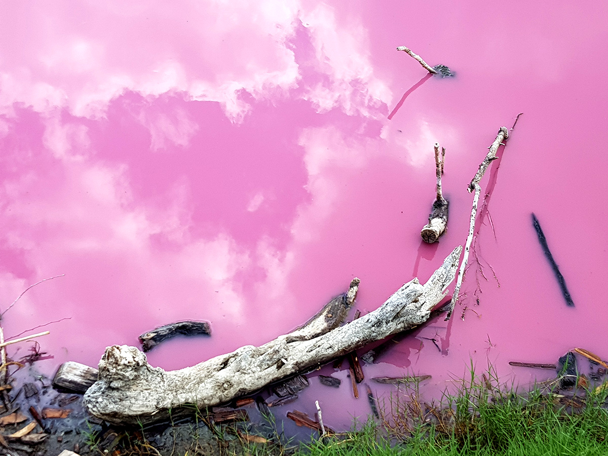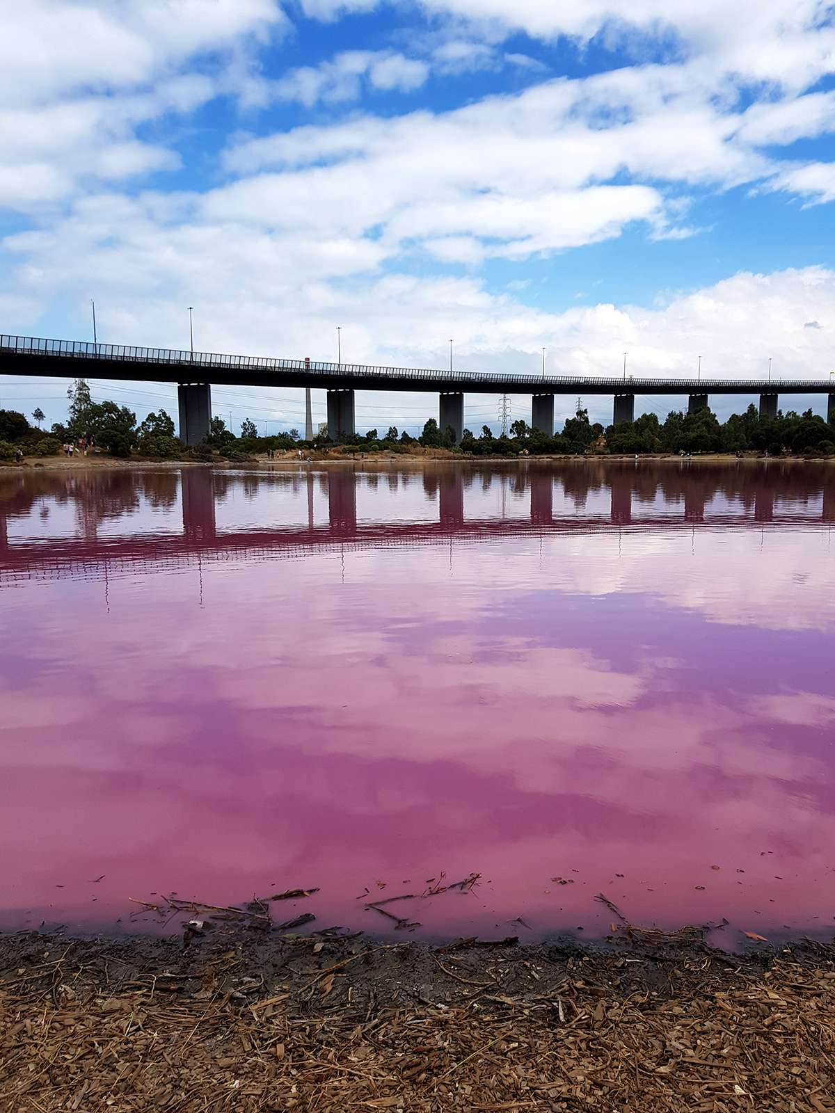 It's a salt lake near the Westgate Bridge in Melbourne which is normally a brown/green colour but turns pink with a mixture of high temperatures and lack of rainfall. In these conditions, algae that grow in the lake produce a beautiful pink pigment.