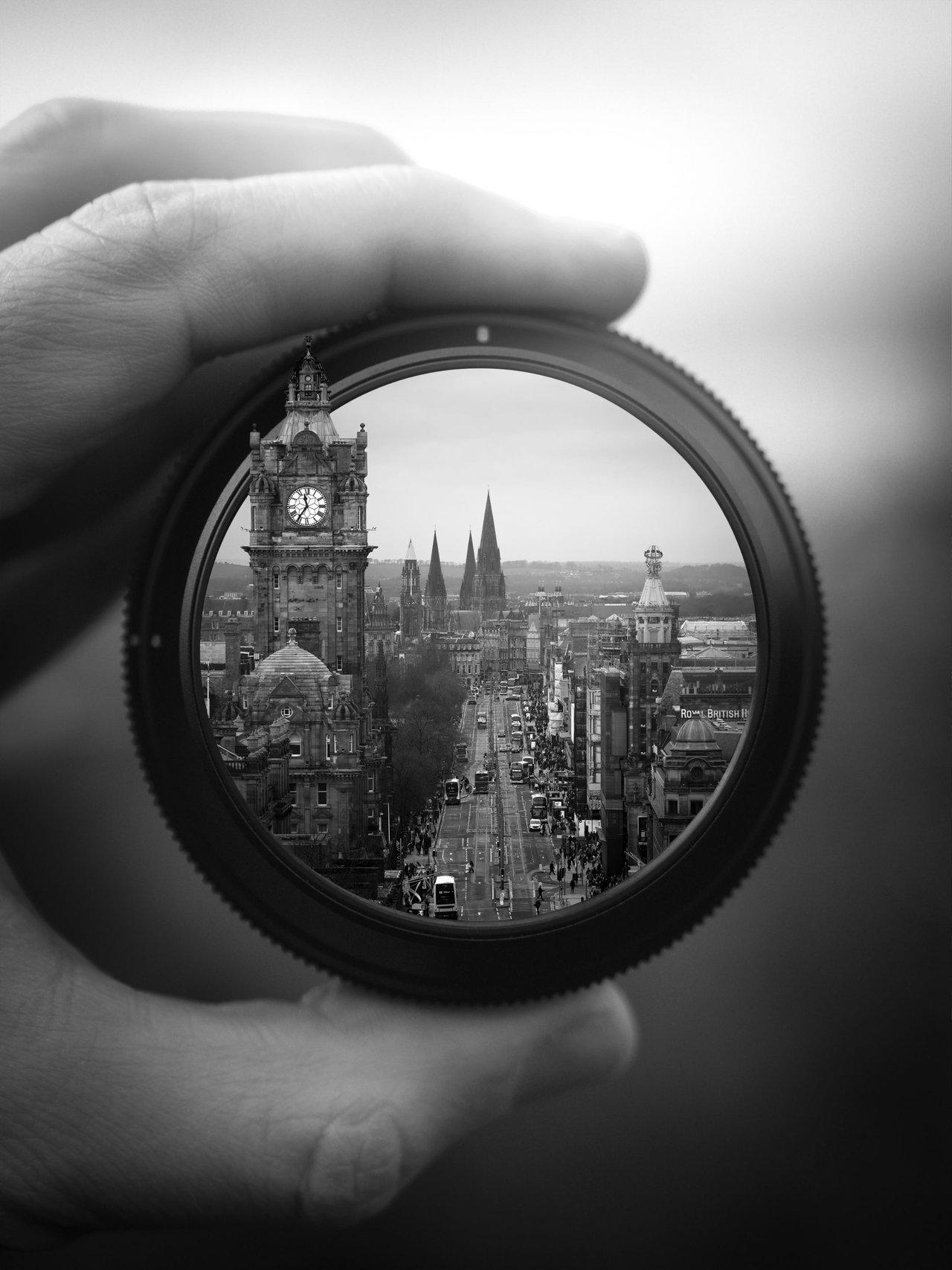 Die Aussicht von Calton Hill auf die Princess Street gehört zu den klassischsten Ansichten von Edinburgh überhaupt. Höchstwahrscheinlich habt ihr diese auch schon mal irgendwo auf den sozialen Medien gesehen. Wenn es um solche Motive geht, die schon tausende Male auf exakt die gleiche Art und Weise fotografiert wurden, versuche ich oft etwas neues zu probieren, das ich bisher noch nicht gesehen hatte. Diesmal tat ich das in Form eines zusammengesetzten Bildes. Ich hielt ein Objektiv mit meiner Hand direkt am Aussichtspunkt vor meine Kamera und setzte später in der Nachbearbeitung ein anderes Foto mit der Aussicht ein. Weiter unten seht ihr auch das ganz "normale" Foto nach der Nachbearbeitung sowie beide RAW-Files, die ich für dieses Composing verwendet habe.