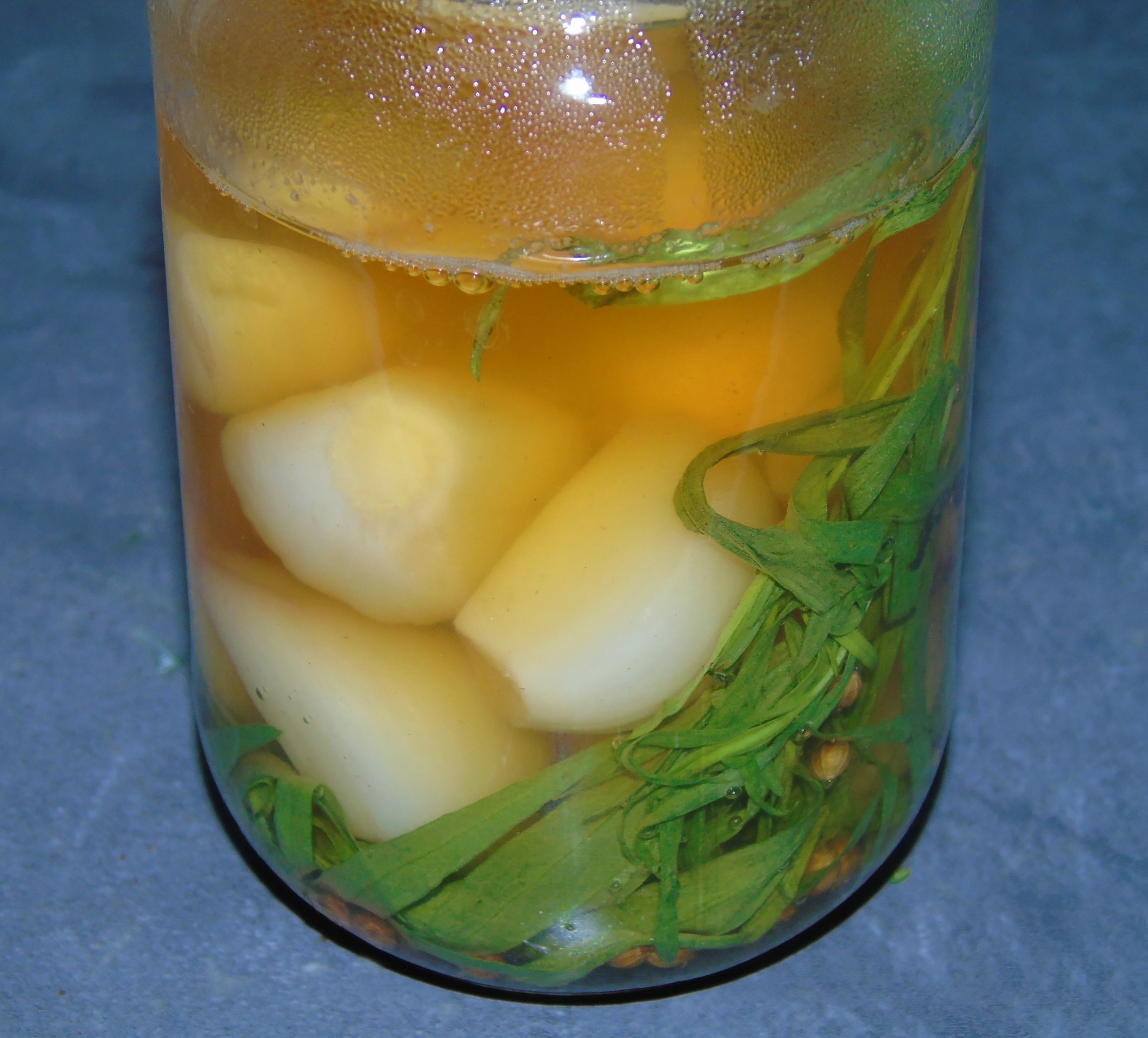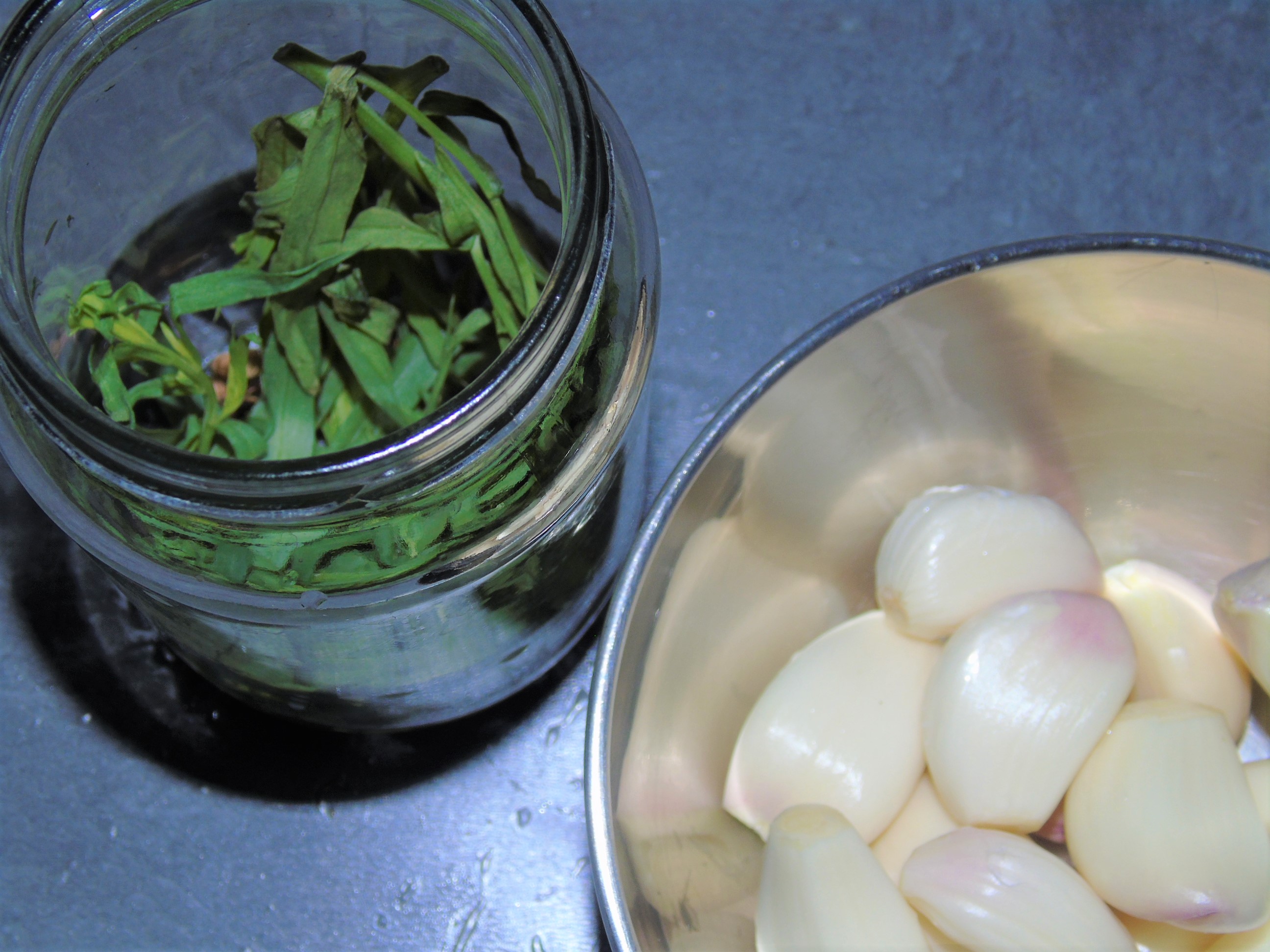 Pendant ce temps préparer vos bocaux avec des aromates, j'ai mis de l'estragon, du poivre, des graines de coriandre.