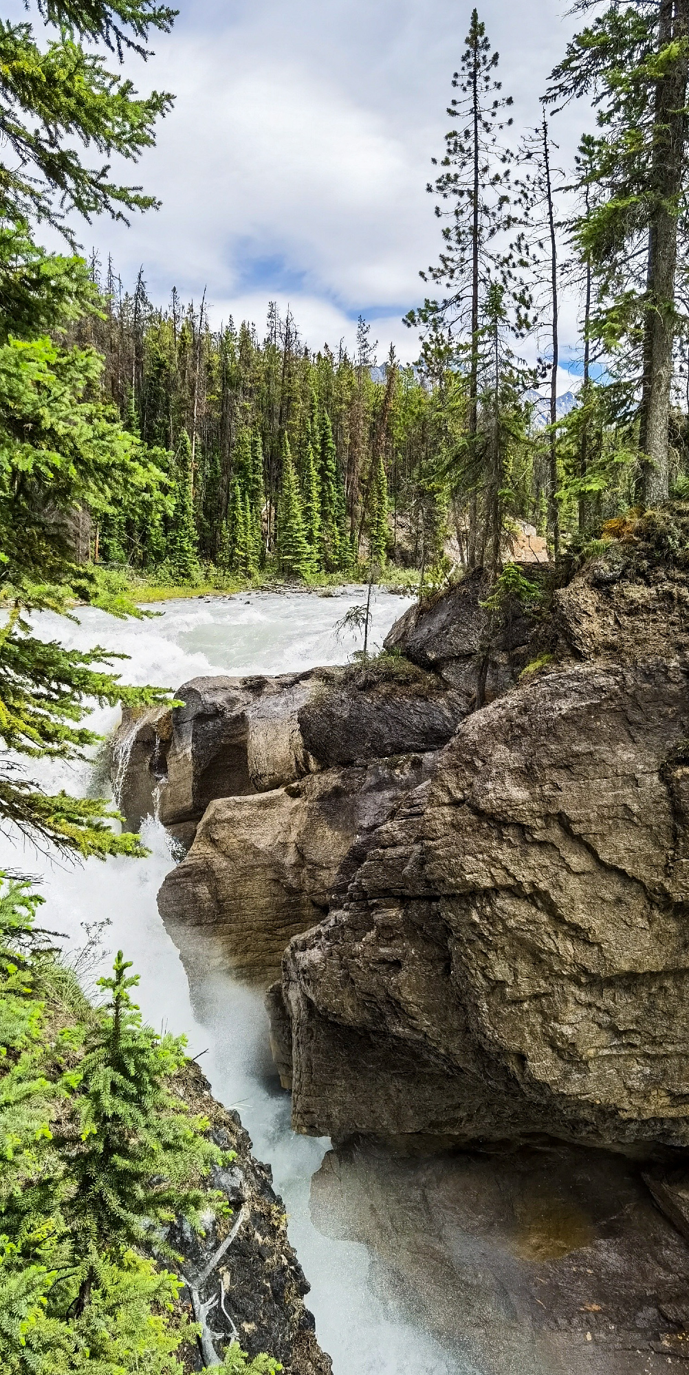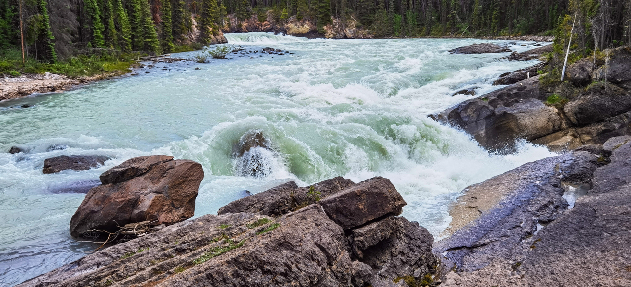 Perhaps “Journey” is not exactly the right word to use, but it did feel like a journey, because I wasn’t wearing proper footwear (think flip flops). I guess it was only about 30 minutes or so to get there (but it felt like forever). It was an unexpected deviation from the main falls. You see, I did not realize there was a lower falls to experience! Next time I will make sure I am properly prepared (rookie mistake). Ok, enough of that. The Sunwapta Falls are located about half way from the town of Jasper to the Columbia Icefields (a highly recommended adventure in and of itself), Alberta, Canada. Considering it was mid-summer, it seemed that there were only a few hikers enjoying the falls, which was awesome, because I prefer the less crowded experiences.