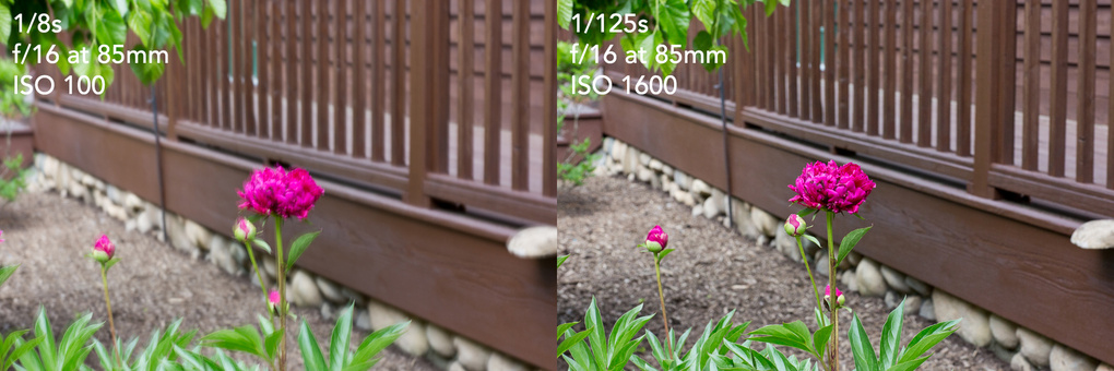 Notice how in this set, I simply couldn't keep the camera still enough for an exposure of 1/8s at 85mm. Even caffeine-free, that's tough to pull off. By increasing the shutter speed 4 stops to a reasonable speed for that focal length and compensating by increasing the ISO 4 stops, I was able to get a sharp image with a large depth of field. Remember, a high ISO, sharp image is always preferable to a low ISO, blurry image.