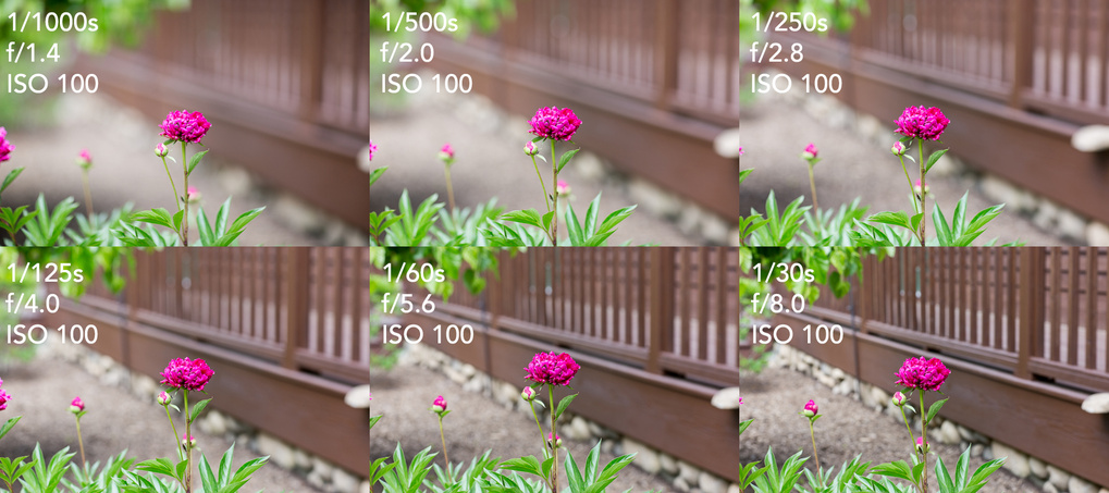 Notice how every time I reduced the aperture by one stop, I also decreased the shutter speed by one stop; thus, the overall exposure is the same in each shot. Nonetheless, the differences are quite noticeable. In the f/1.4 example, the flower in the center of the frame is quite prominent and isolated; the busy deck railing melts away rather nicely. By f/8, my depth of field is much bigger; the deck railing is much more prominent and it isn't clear what the focus of the image is. Also, in the last two images, I'm really beginning to risk camera shake by shooting at speeds slower than the reciprocal of my focal length (I tend to err on the conservative side of that classic rule anyway), 1/85s. Luckily, I've been working on reducing my caffeine intake, so my hands appear to be a bit steadier than in the past.