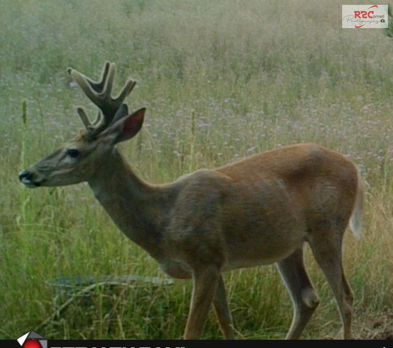 Aquí hay una fotografía que fue tomada hace un par de meses por una de mis cámaras "trail". Aquí todavía está en terciopelo, pero en la actualidad sus cuernos se han endurecido.