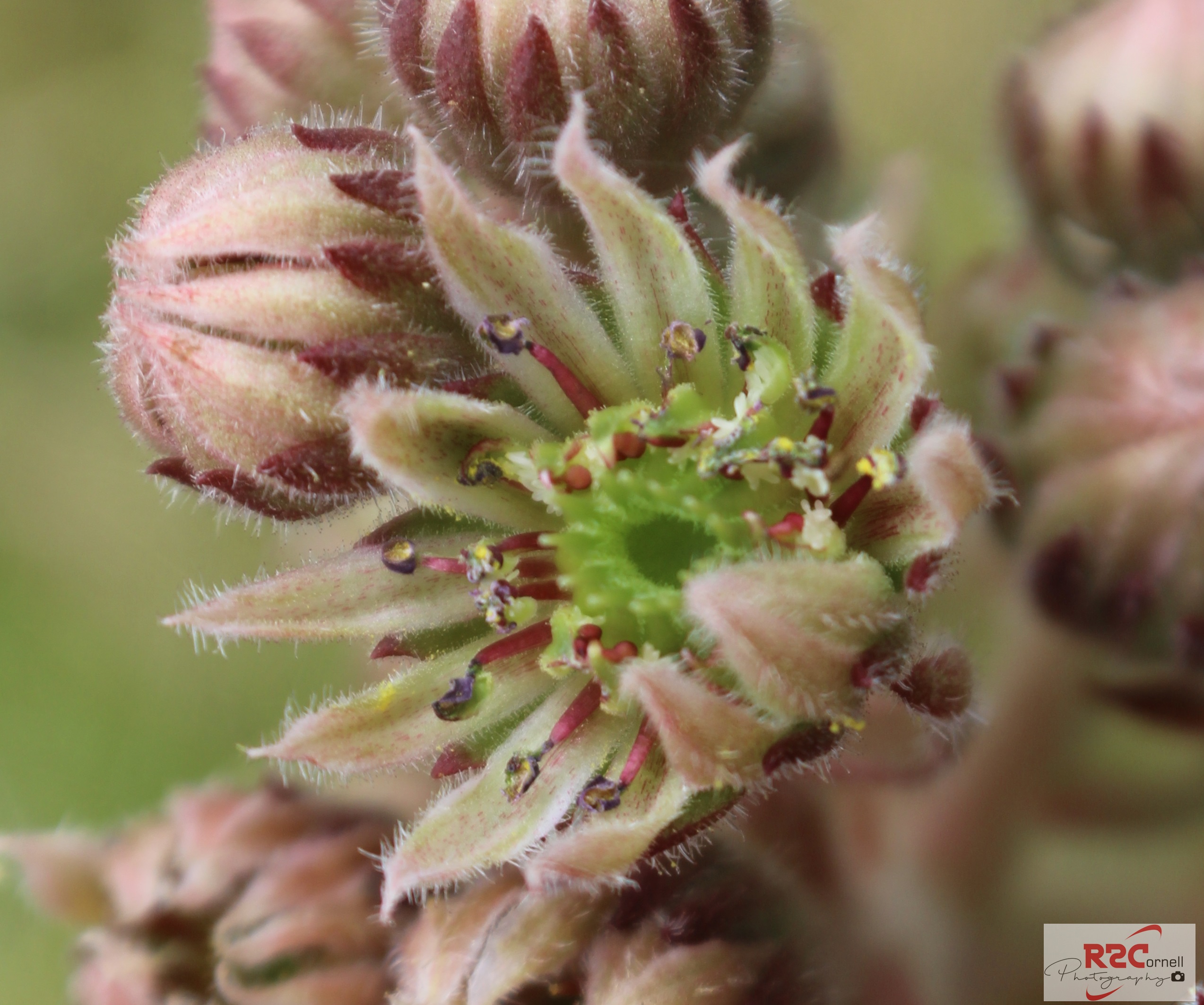 This next photo is of a blossom from a plant that is called Hens and Chicks. Last year was the first time I had them bloom, and they are at it again. I took a macro-shot to bring out the uniqueness of the bud.