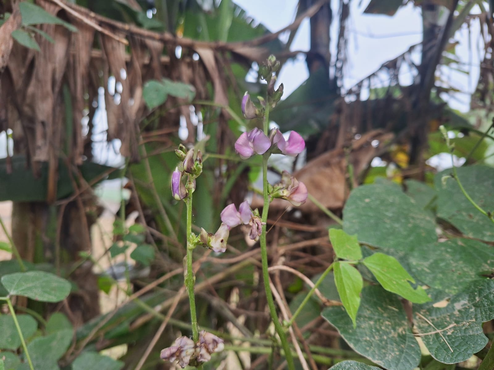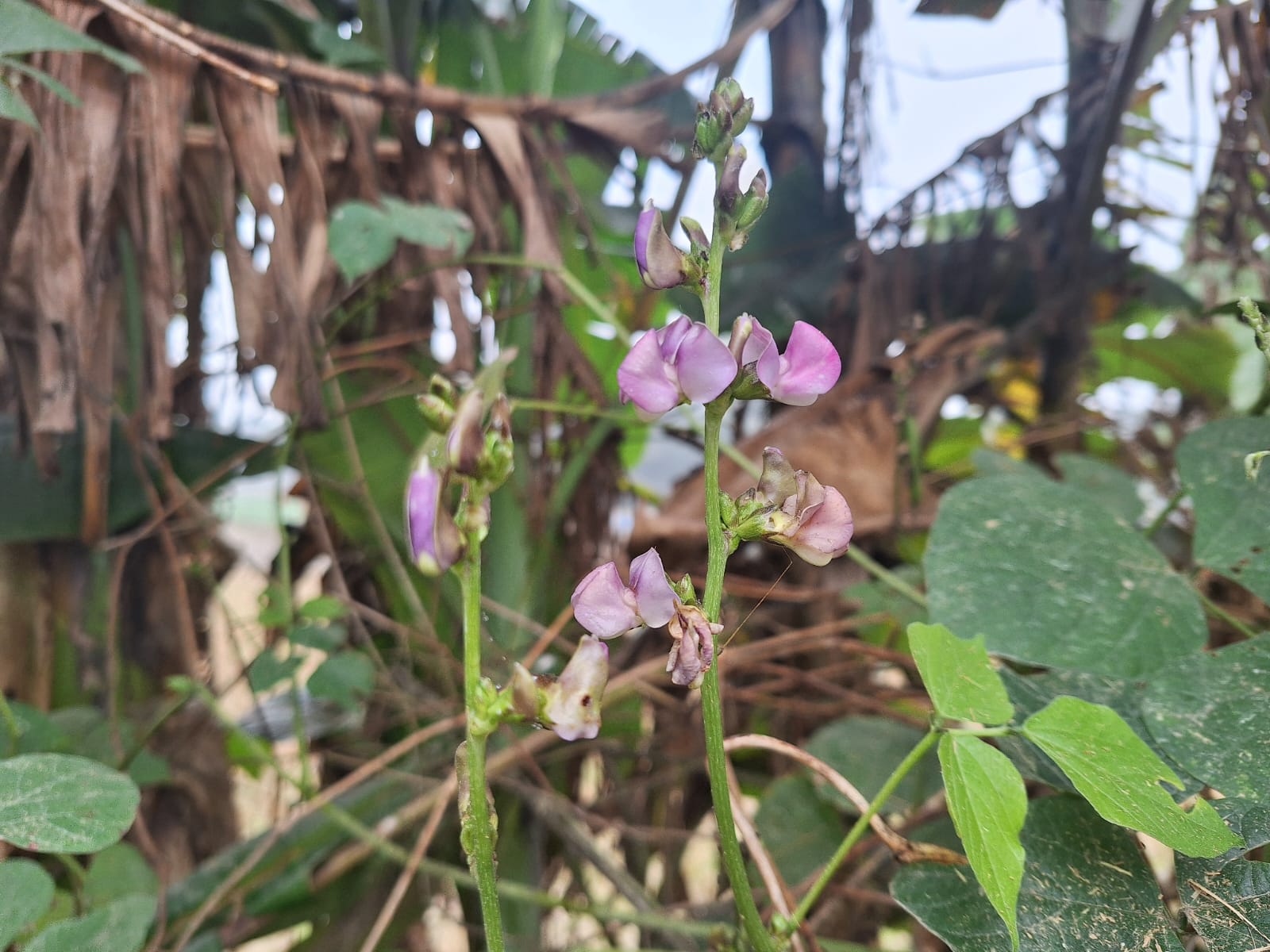 The flowers have bloomed in a mixture of purple and pink. These flowers later turn into beans as the fruit. Around it, creeping leaves and branches of other trees are visible, which usually indicates the familiar environment of the bean plant. The bean plant mainly depends on the surrounding plants for support.