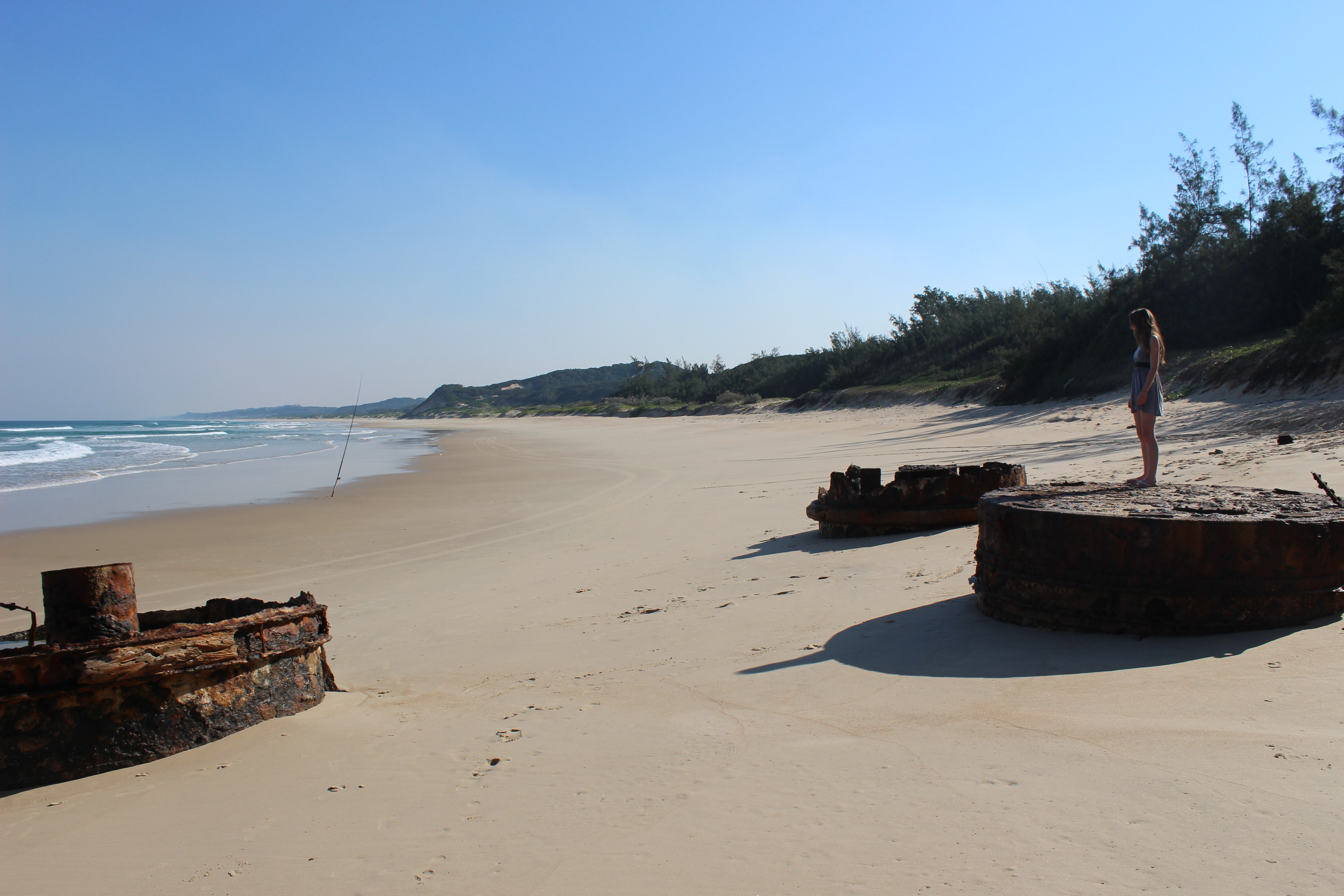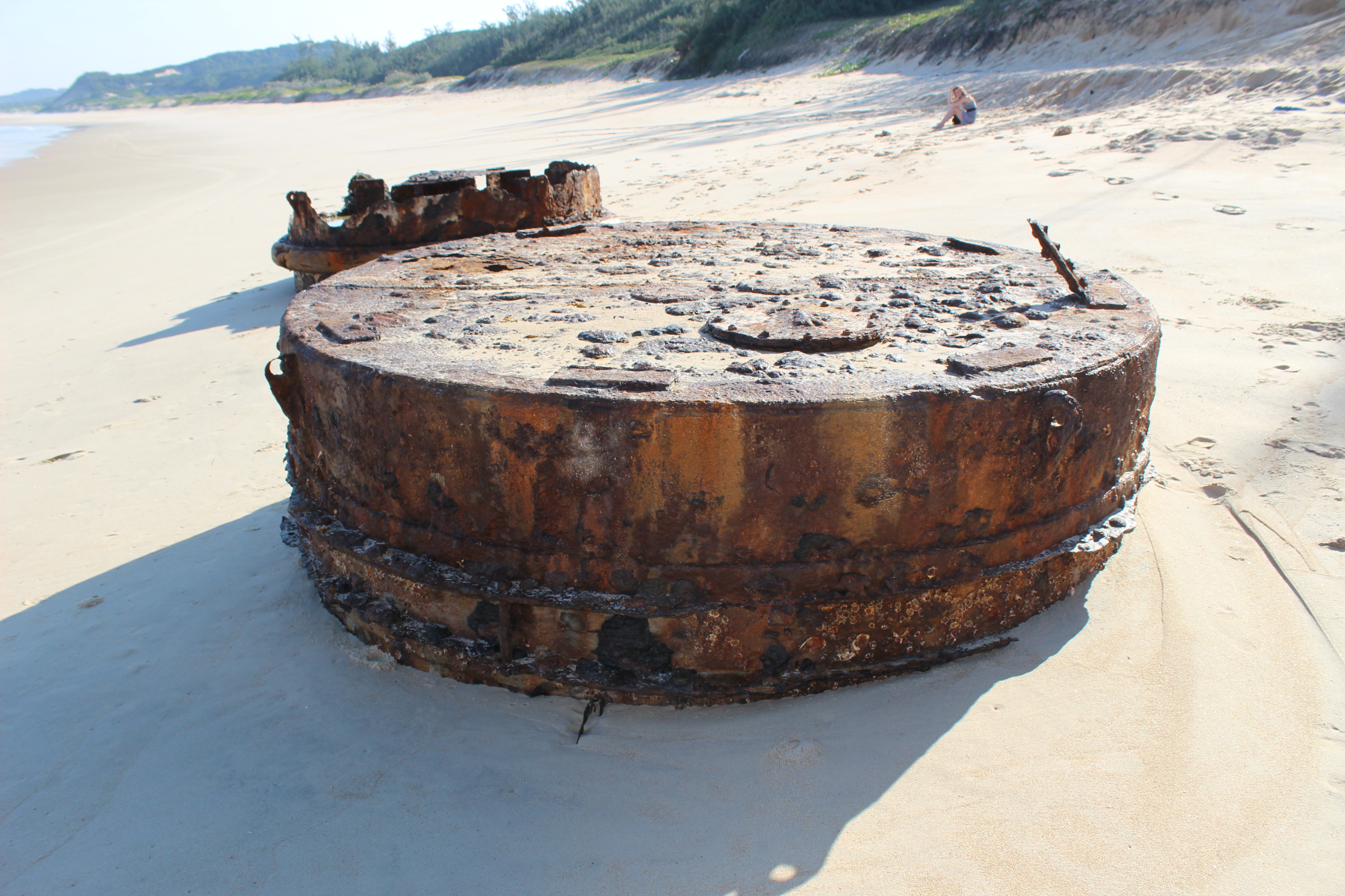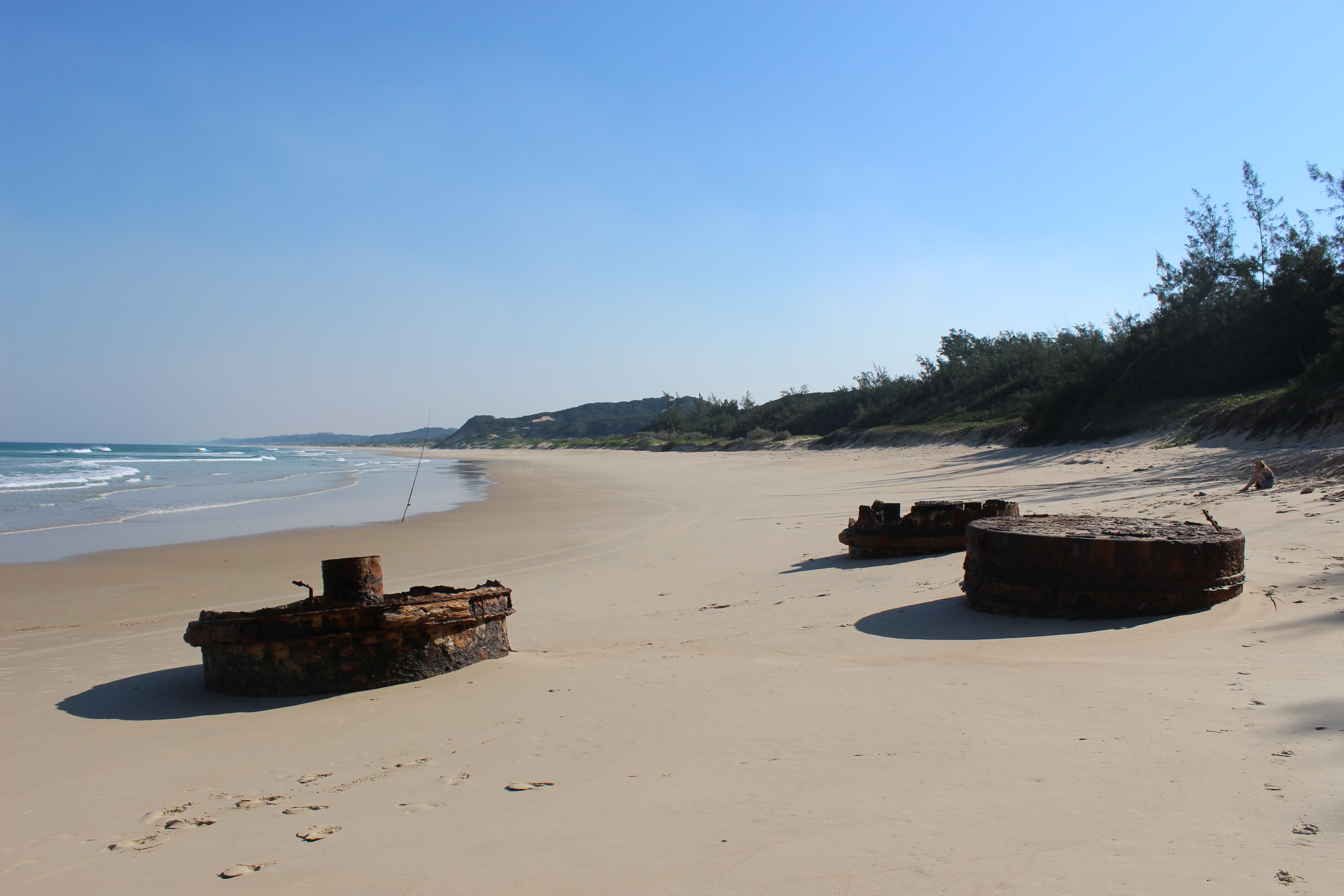 Last week I embarked on a road trip to Mozambique in Southern Africa with my family. We decided to go exploring along some very challenging 4x4 routes until we came across a nice spot to stop and swim in the ocean. As we walked towards the ocean from where we had parked our car and started to see more of the beach, the first thing we noticed was these three large, cylindrical rusted metal objects.