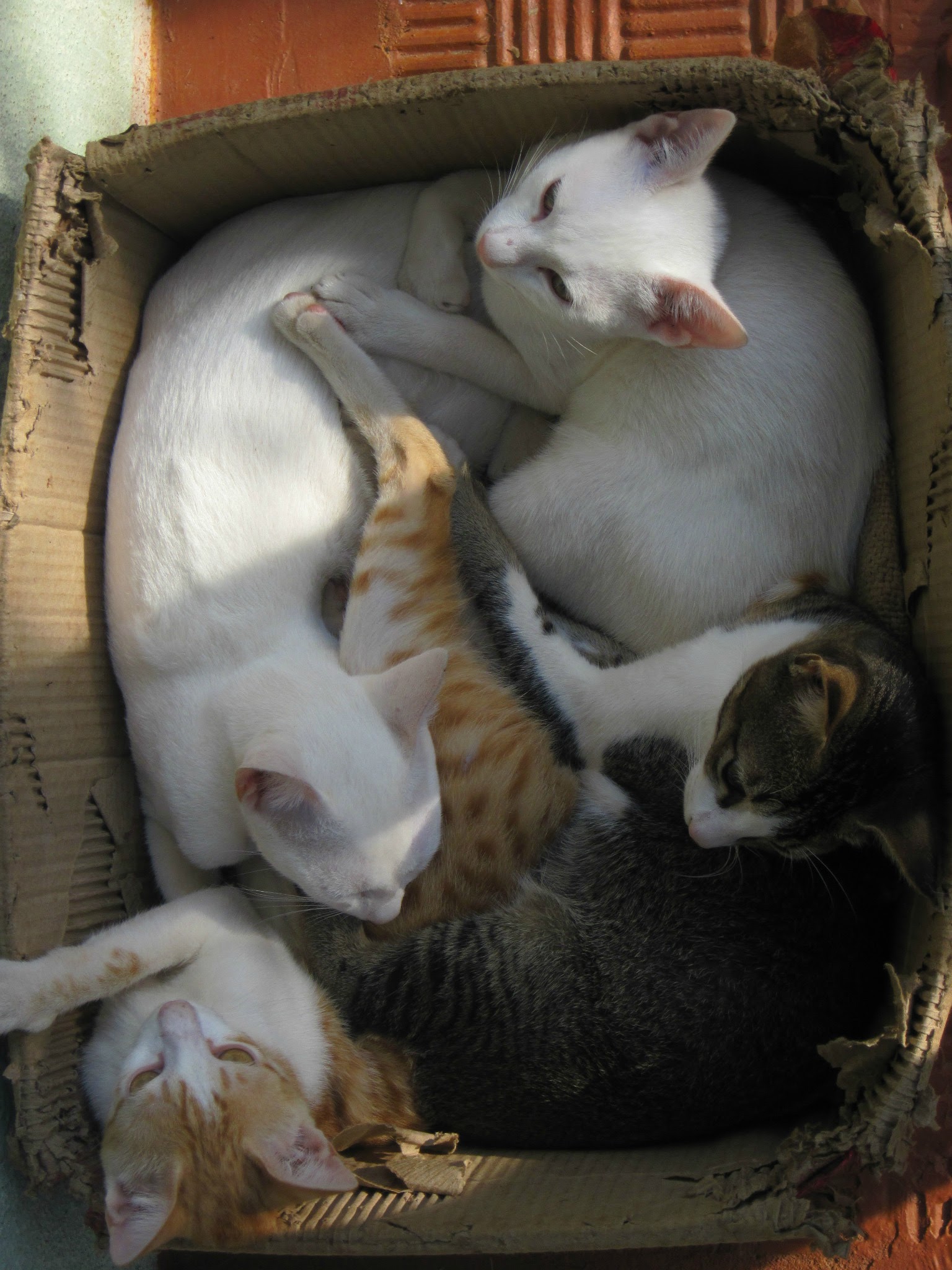 Hello Steemians! I realized I haven't posted any photography posts in a very long time and decided to make one right now. I found one of the oldest pictures I have saved in my phone. This was taken somewhere between 2012 or 2013, when me and my brother were visiting our uncle and aunt. I don't remember if it was me or my brother who took this picture, but I sure do remember the amount of fun we had at that place. These cats are strays that sometimes came to their backyard for food and shelter and our aunt placed an empty carton for them to curl in. Never expected four of these furry babies to curl inside the same box. It was quite a site to see. I love cats to death and this picture is like my lucky charm.