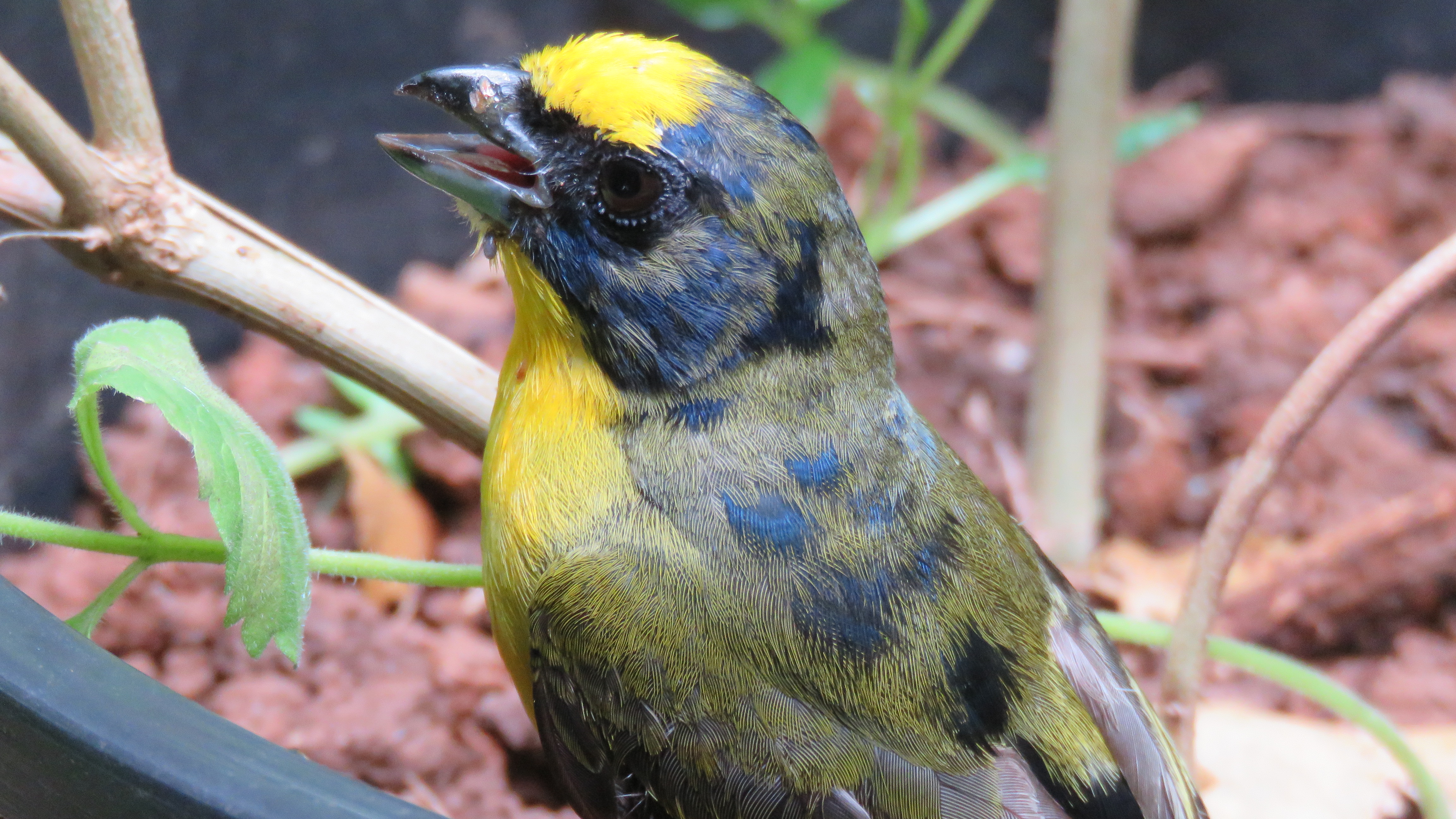 Think I found it! Most likely an Euphonia laniirostris, a juvenile male! He will get all blue above when fully adult :)
