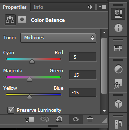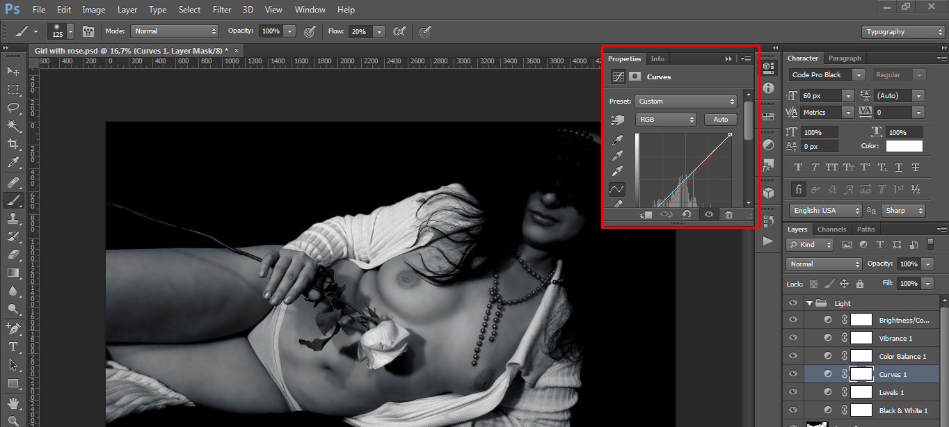 The main layers for creating this effect were: Black and White, Curves and Color Balance.