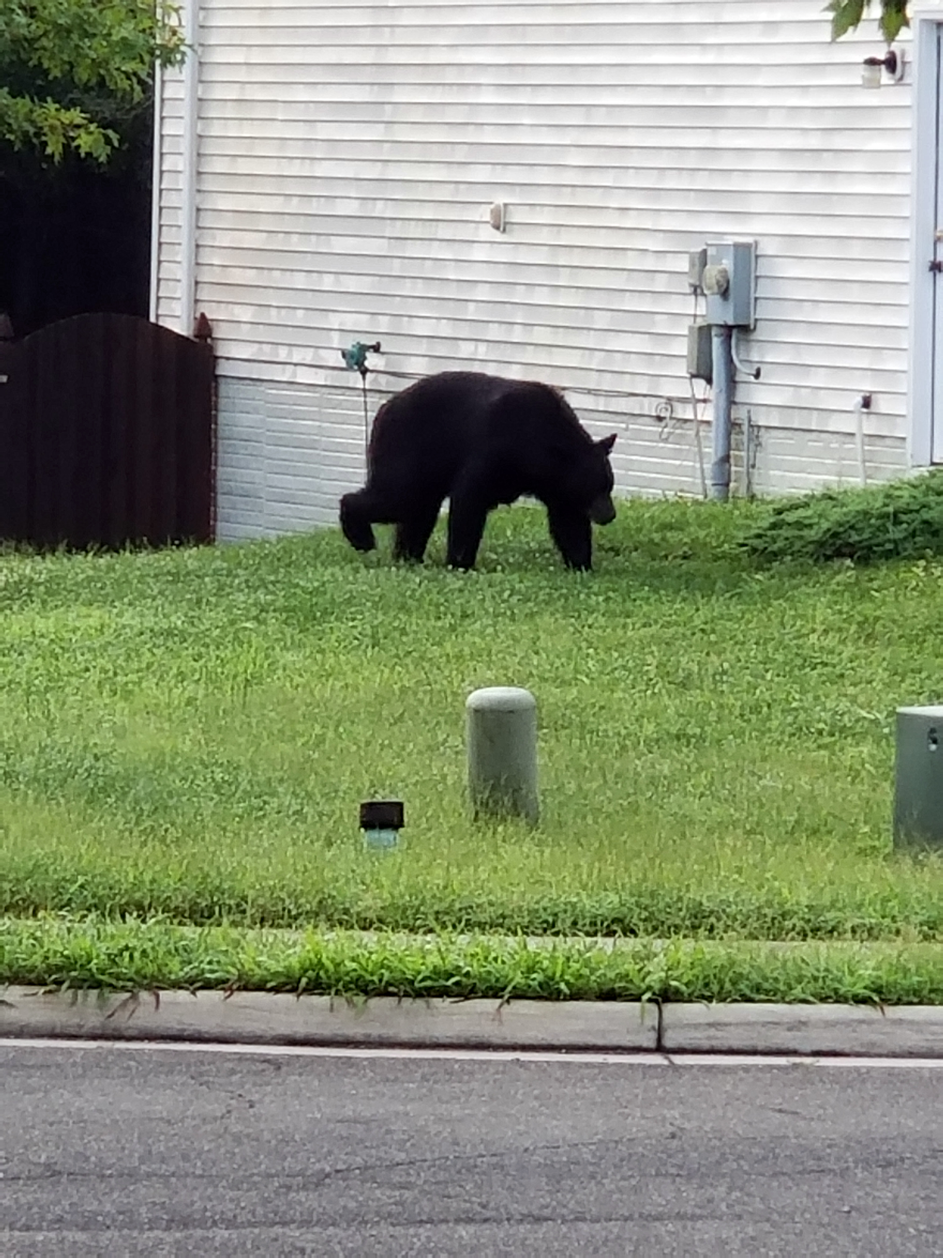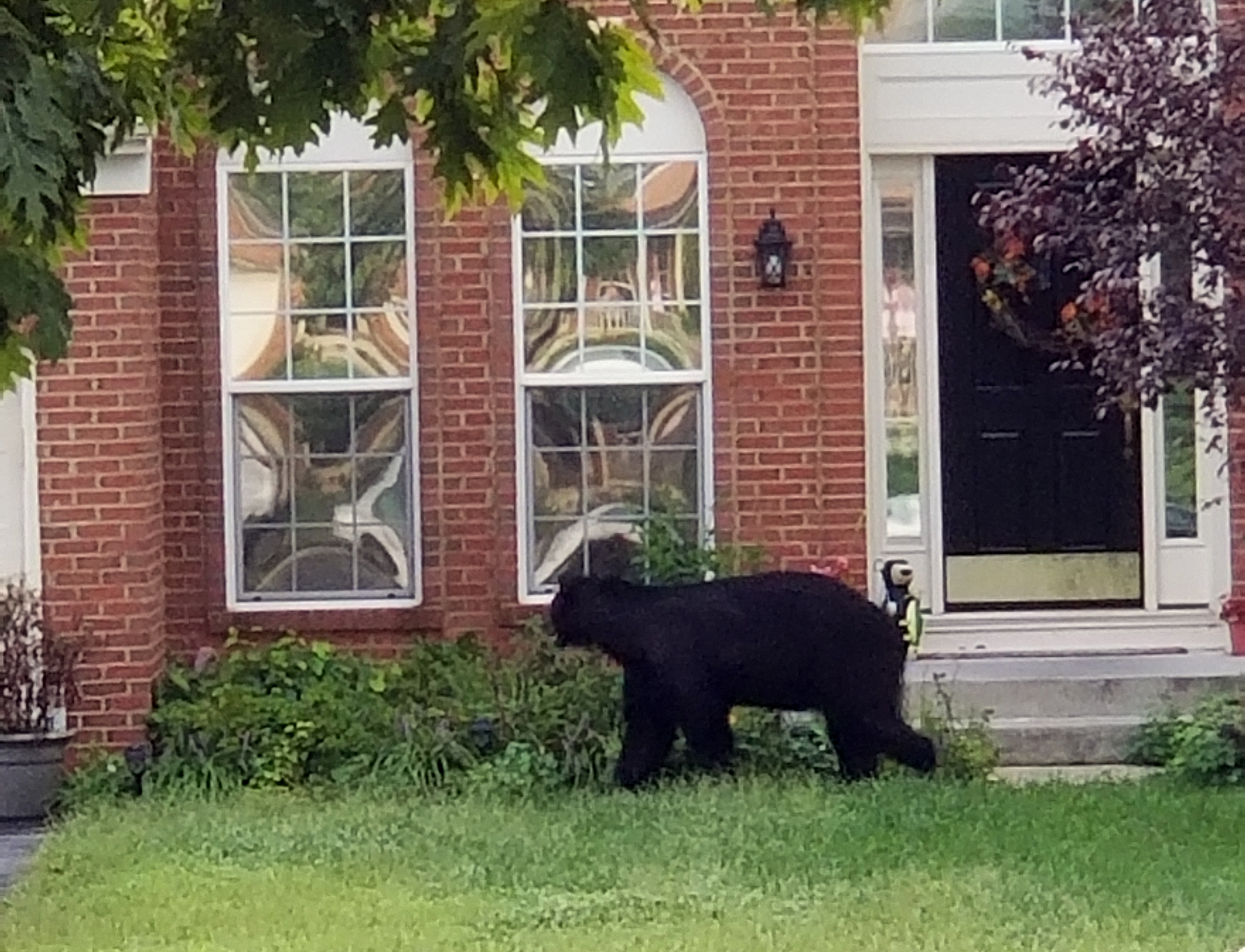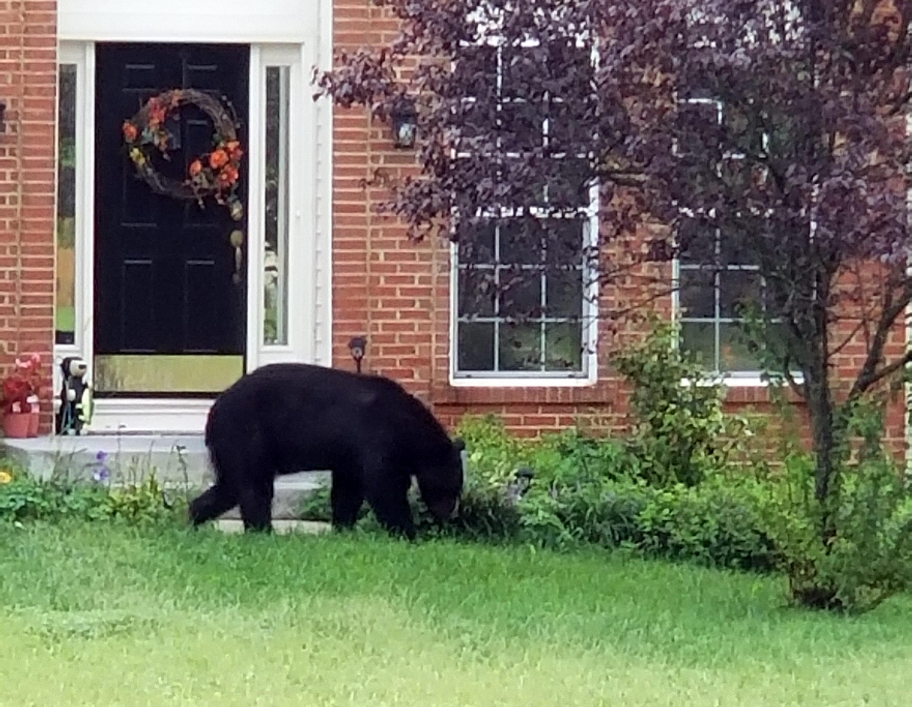 This morning, my wife and I were enjoying some coffee on the front porch. This has been a missed event with the heat and rain from the summer. While drinking, I watched as a hummingbird hovered nearby. Too fast for me though as I could not get my phone out fast enough for a nice photo. Shortly after, however, I spotted a black bear strolling through our neighbors' yards. This time, I had my camera ready.