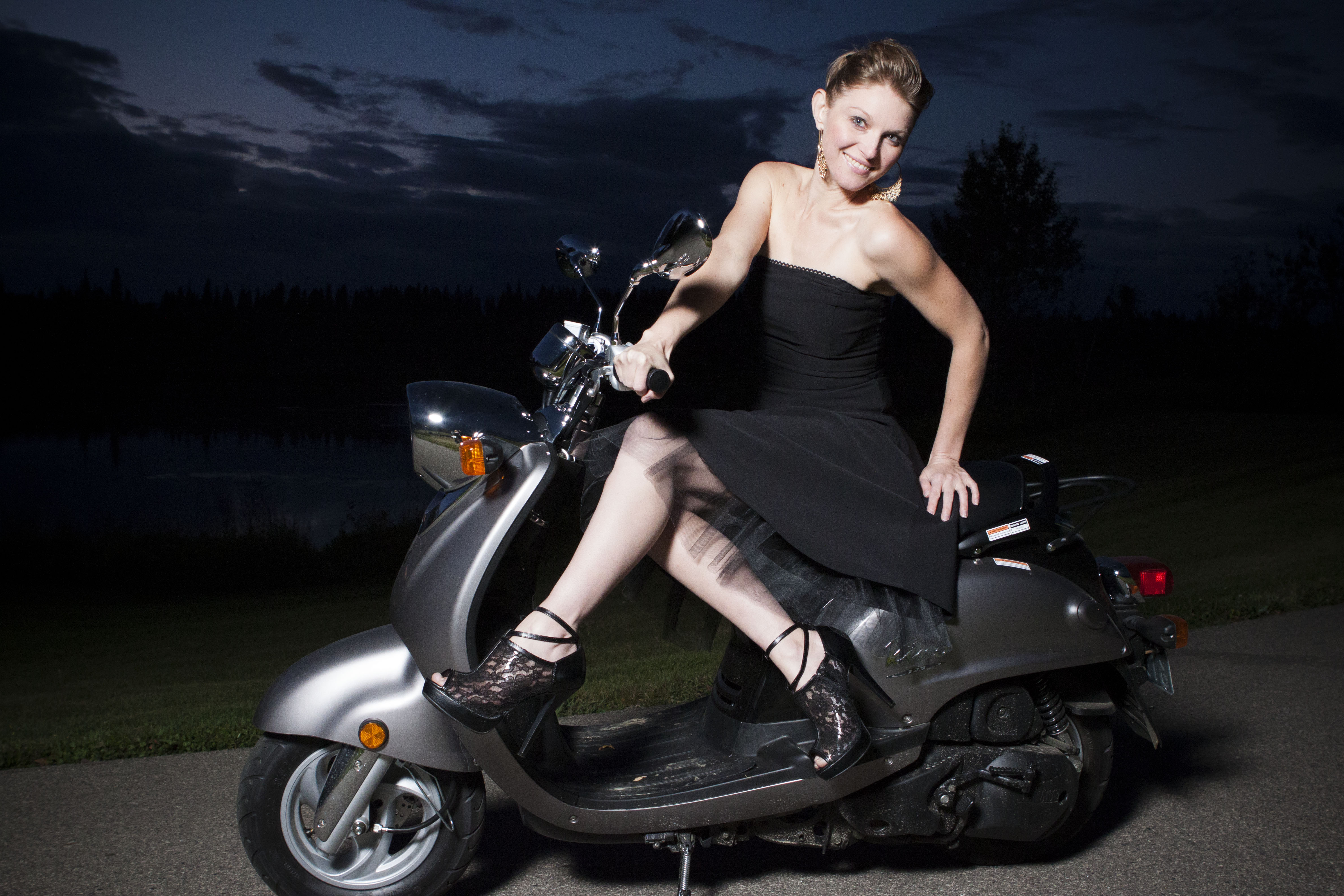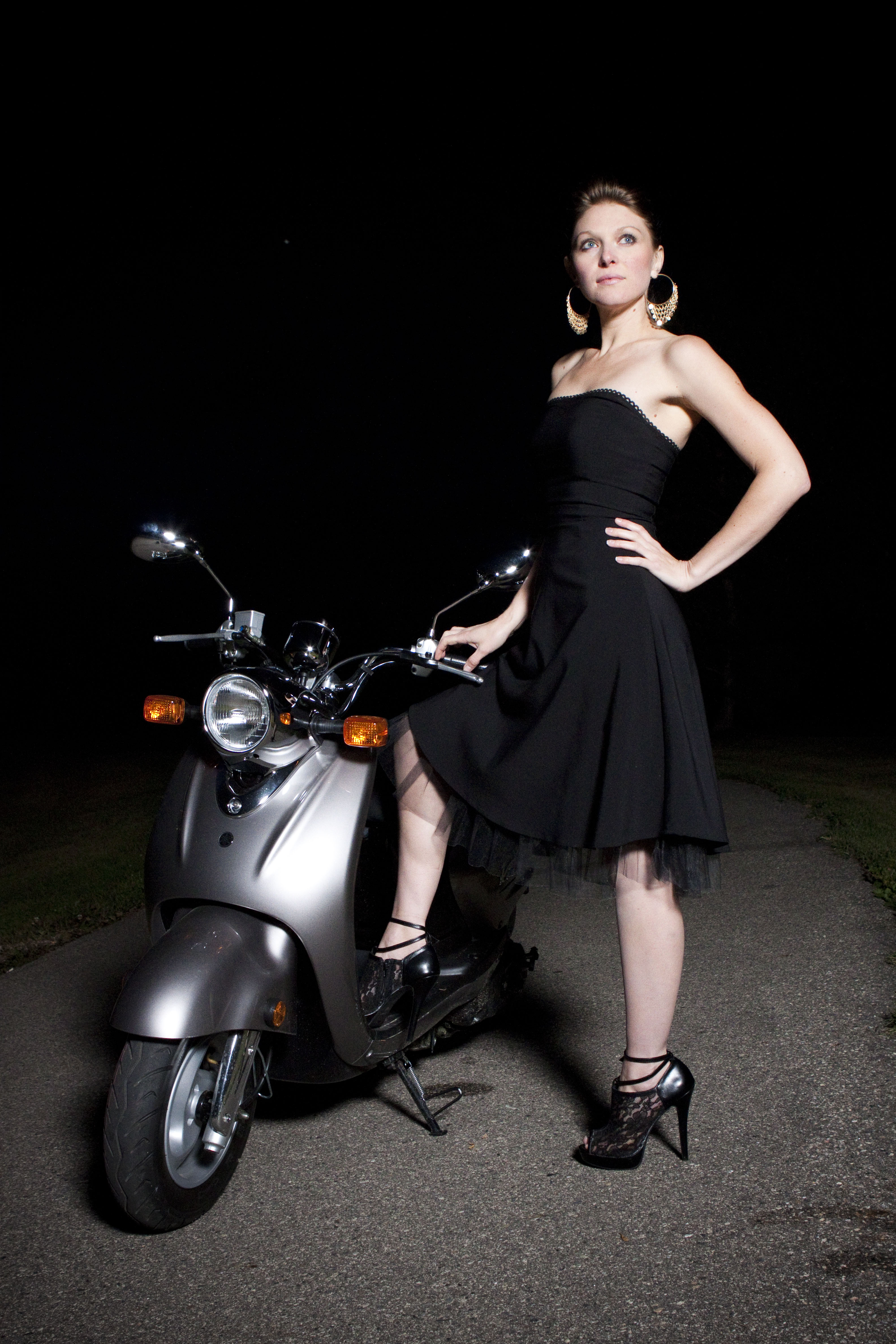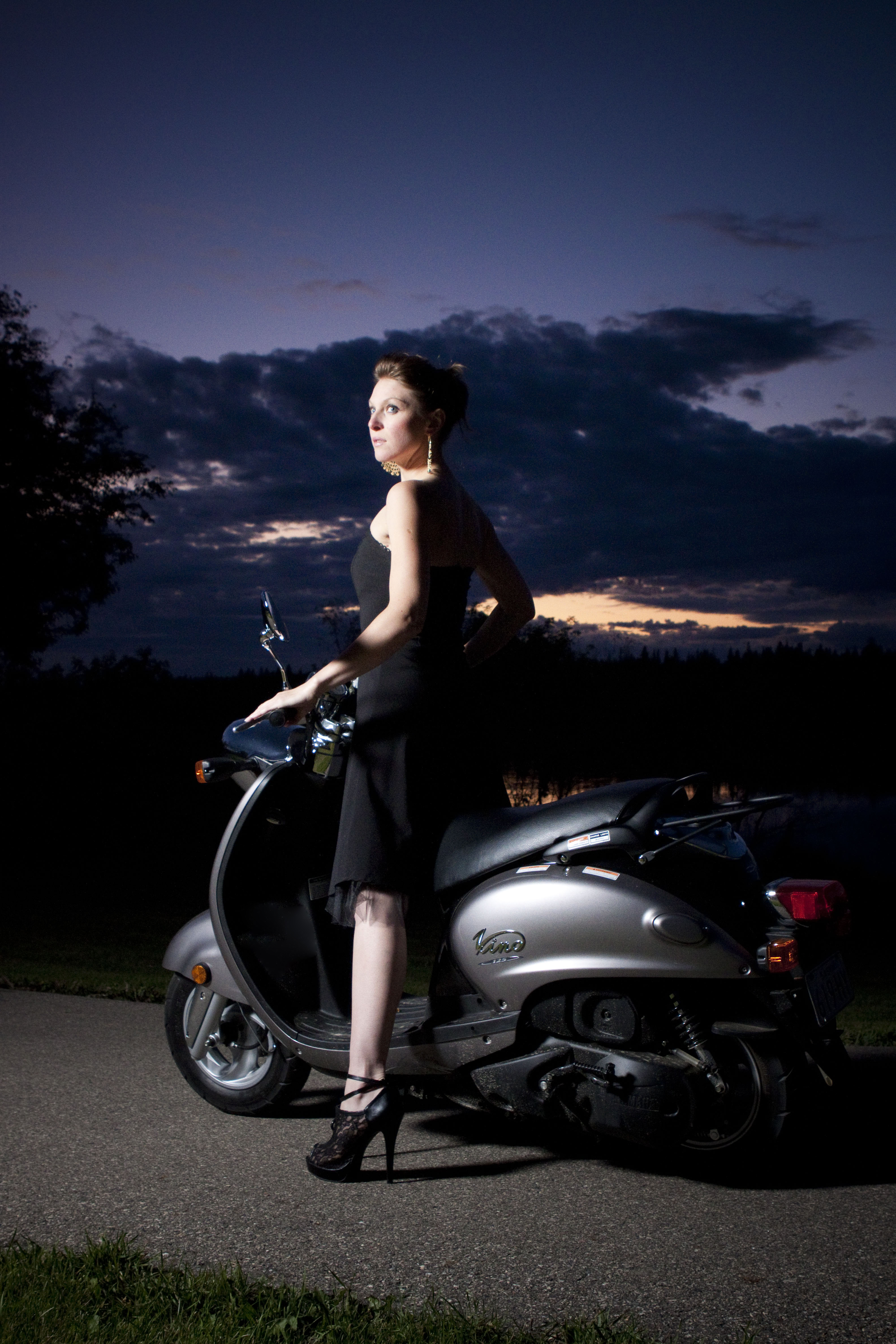 Hello again! In this post I do a photo session with a Kino scooter. Being inspired by my purchase of a new Aprilia scooter, another family member choose to get one as well, my amazing mother. She bought a Kino, had it shipped and began riding! I thought it was the cutest little thing on wheels! Inspiration kicked in, and I wanted to do another shoot using this particular scooter, but instead of a leather jacket, I put a more feminine twist to this shoot. When I do these shoots, I often have a small window of opportunity to do them, and this one was no exception! Hence for all you scooter lovers, I did not have time to give the Kino ride a full cleaning! So you will notice that! When I have a small window of opportunity, it's usually last minute, and a very tight squeeze of an hour or two! I dove in, and quickly decided on this location. I wanted a backdrop with this setting. I loved the clouds and water in the background. We still had some light. With the studio light set up, you could get some depth from the background, rather than just the black background from my Aprilia photo session. I made this shoot playful, fun, and did many different unique poses. The dress, the shoes, and the Kino overall gave off a fun vibe! This shoot could also have been done in daylight with an 85mm lens, an hour or two before sunset, with a cute dress and would have created some beautiful shots! Perhaps one of these days I will create a session like that, but at this time for this shoot, this is the idea that sprang in my mind and I went with it! Enjoy!
