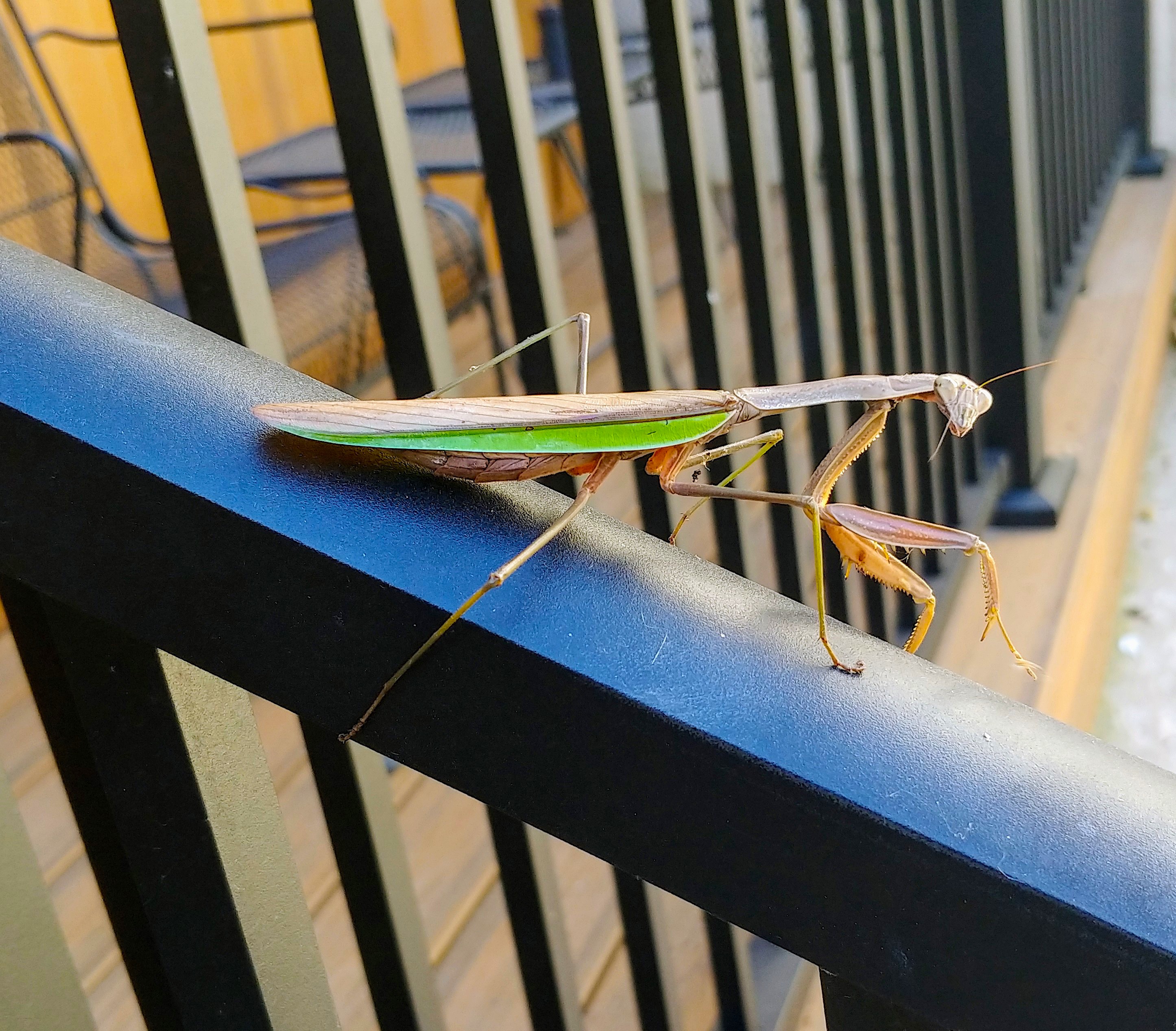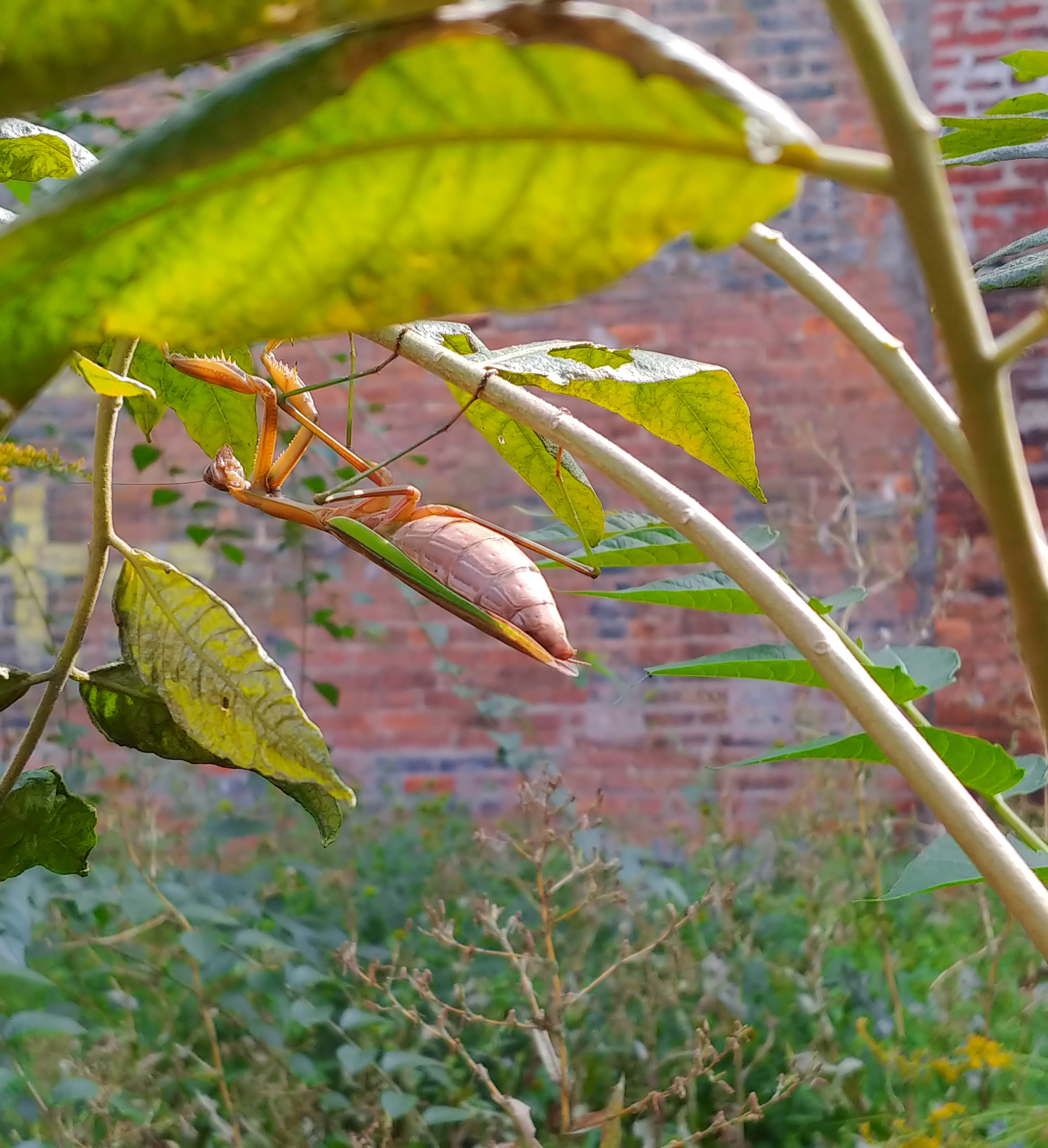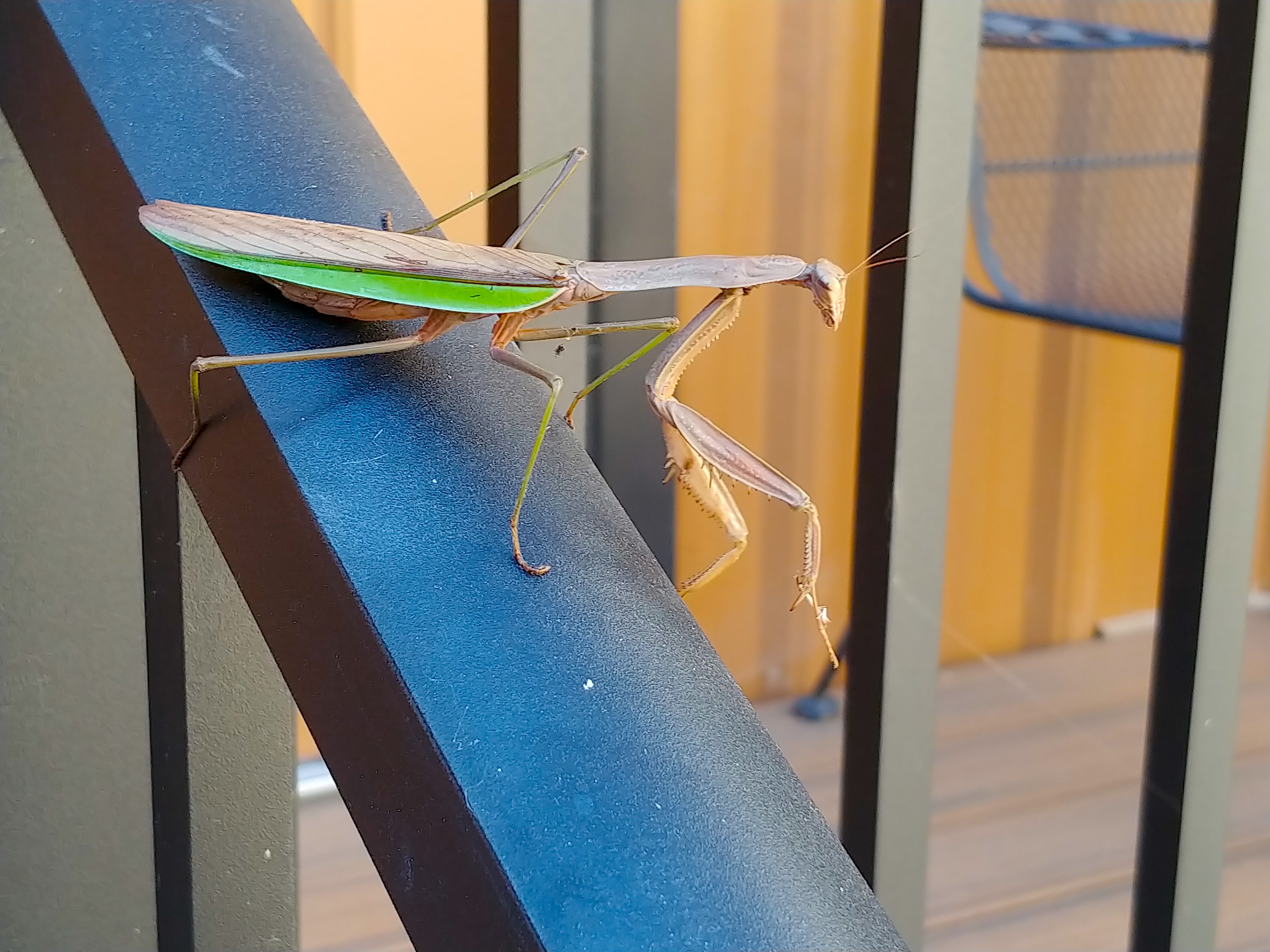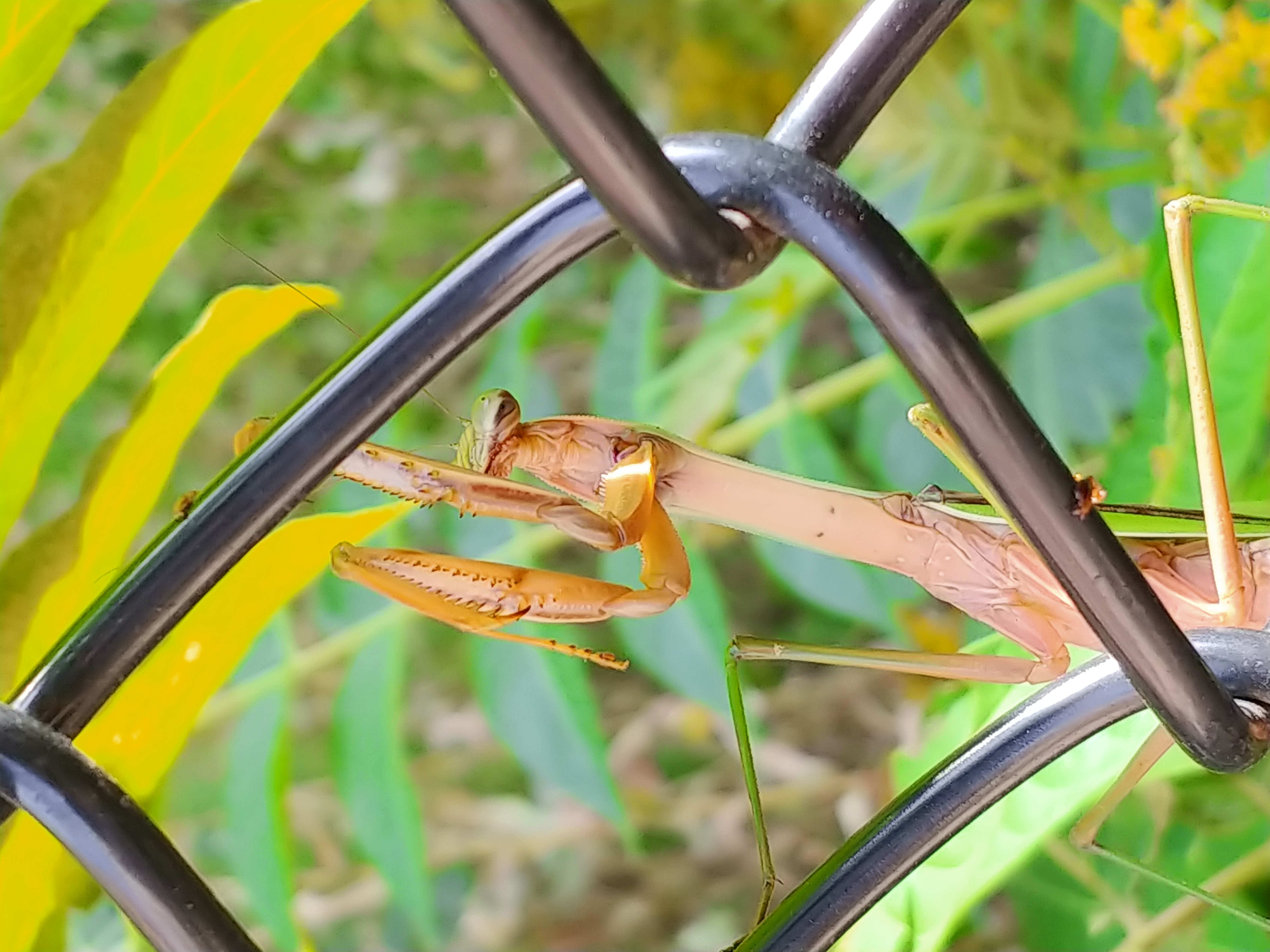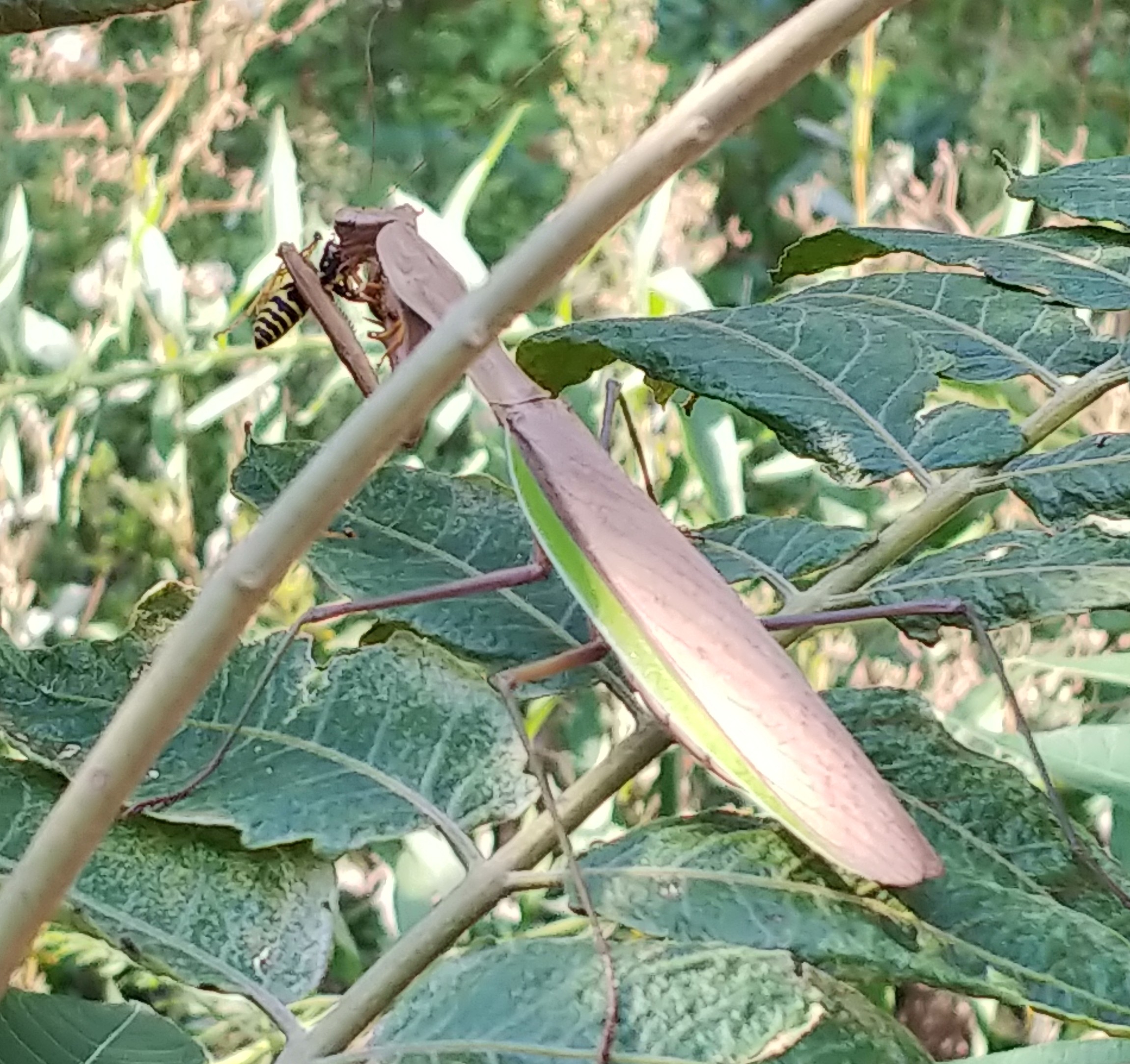 For several weeks now we have had many different praying mantis hanging out behind the office. We started seeing them about a month ago and there are still a few left. There have been so many that it is like a praying mantis sanctuary. We have seen several pregnant and a few males. In one of the pictures you can see it eating a live wasp.