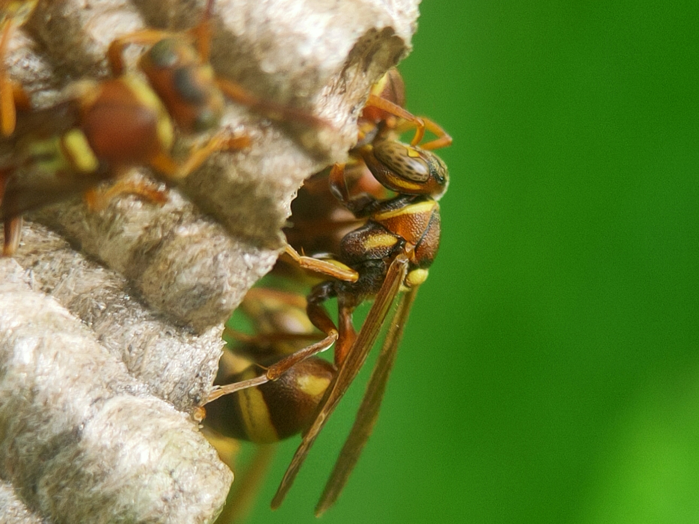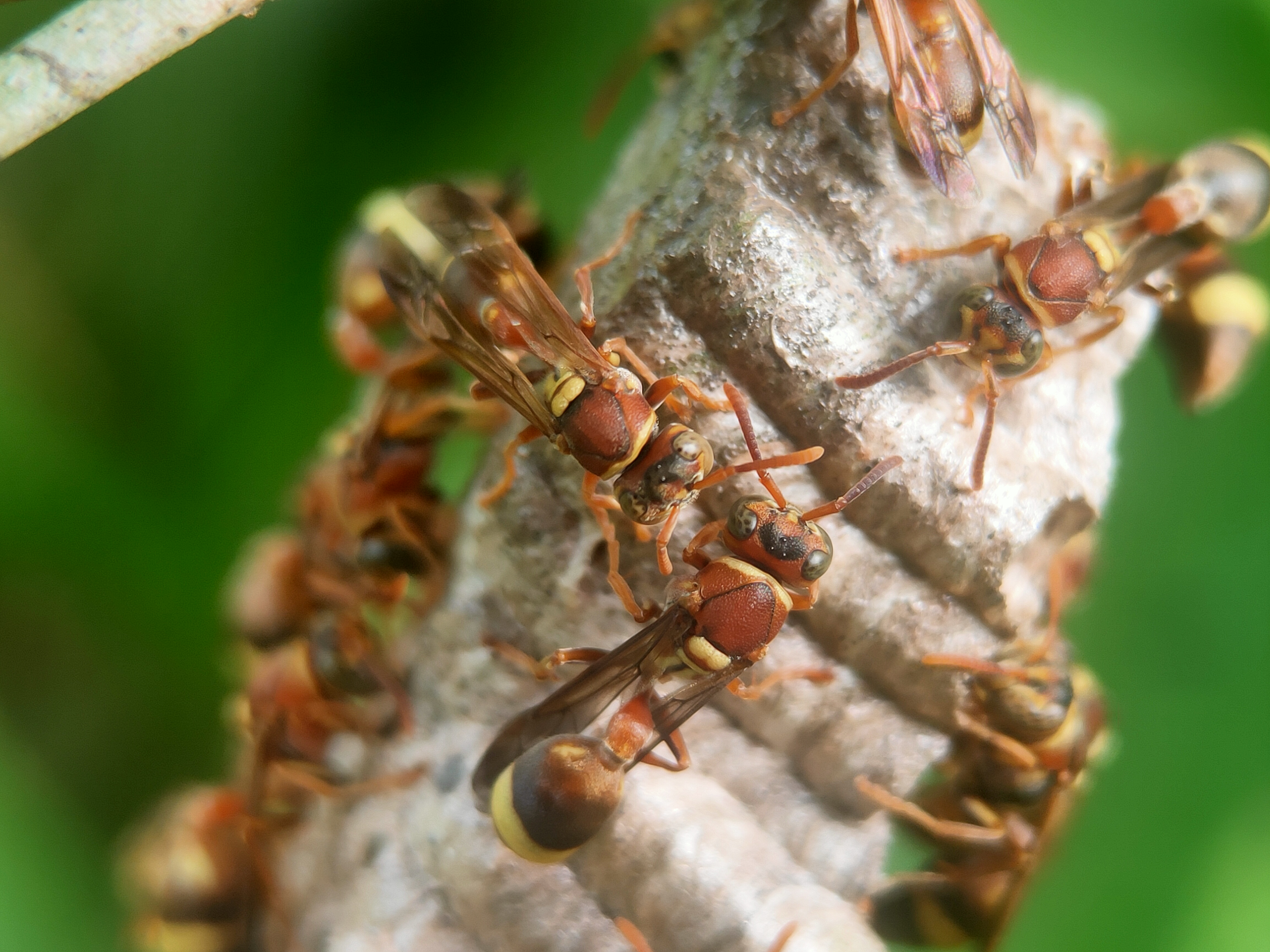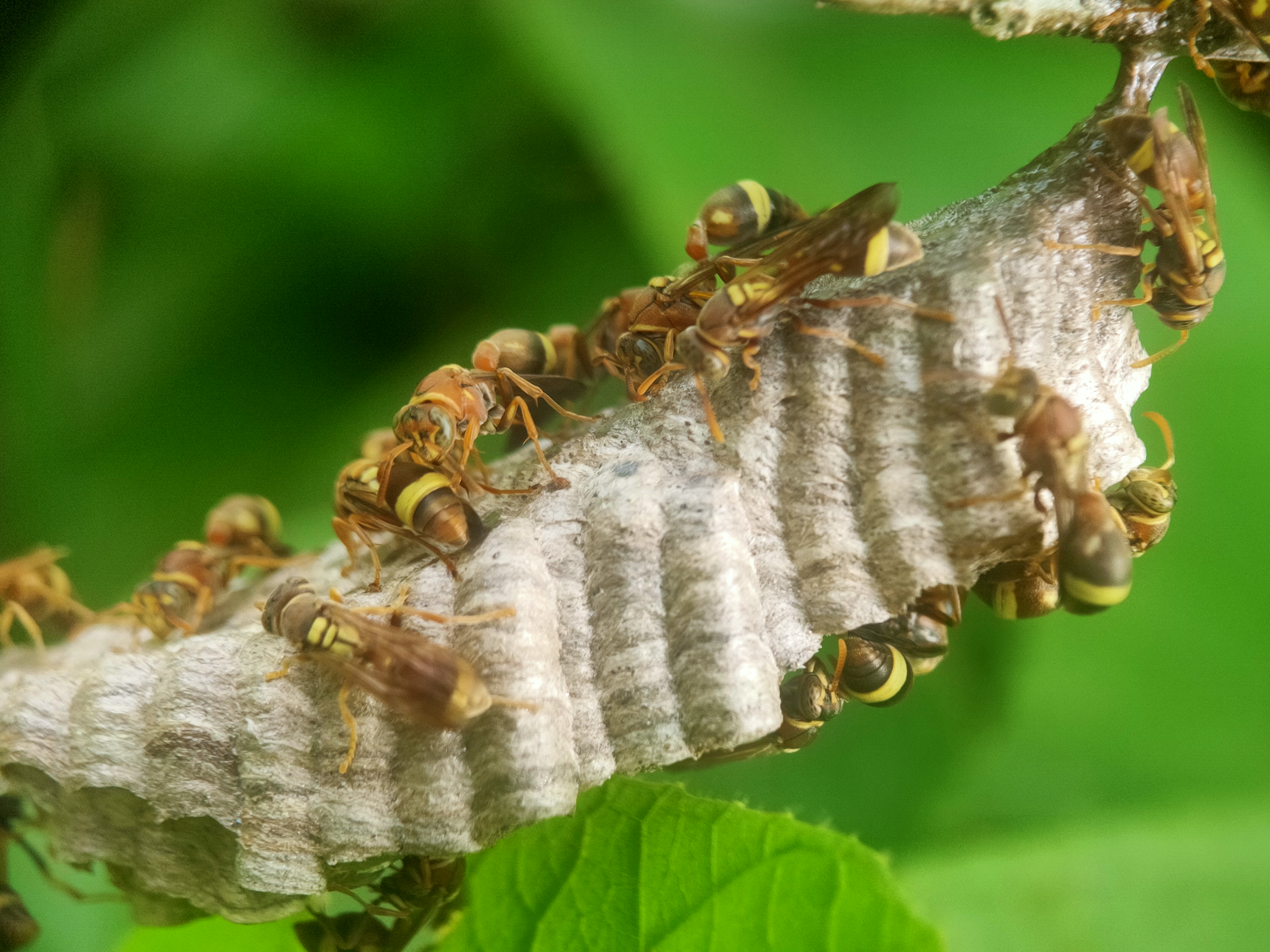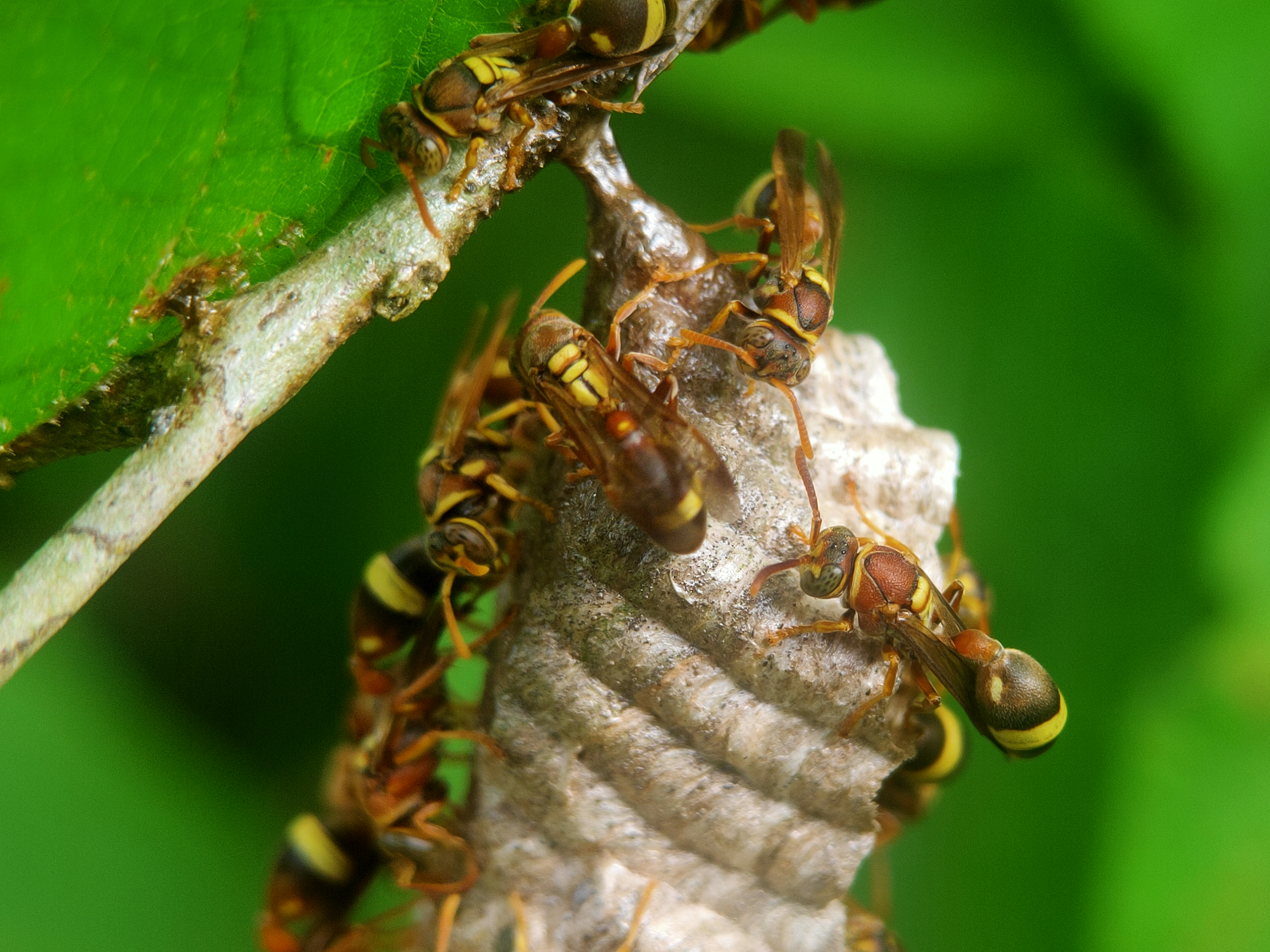 Paper wasps are vespid wasps that gather fibers from dead wood and plant stems, which they mix with saliva, and use to construct nests made of gray or brown papery material. Some types of paper wasps are also sometimes called umbrella wasps, due to the distinctive design of their nests.