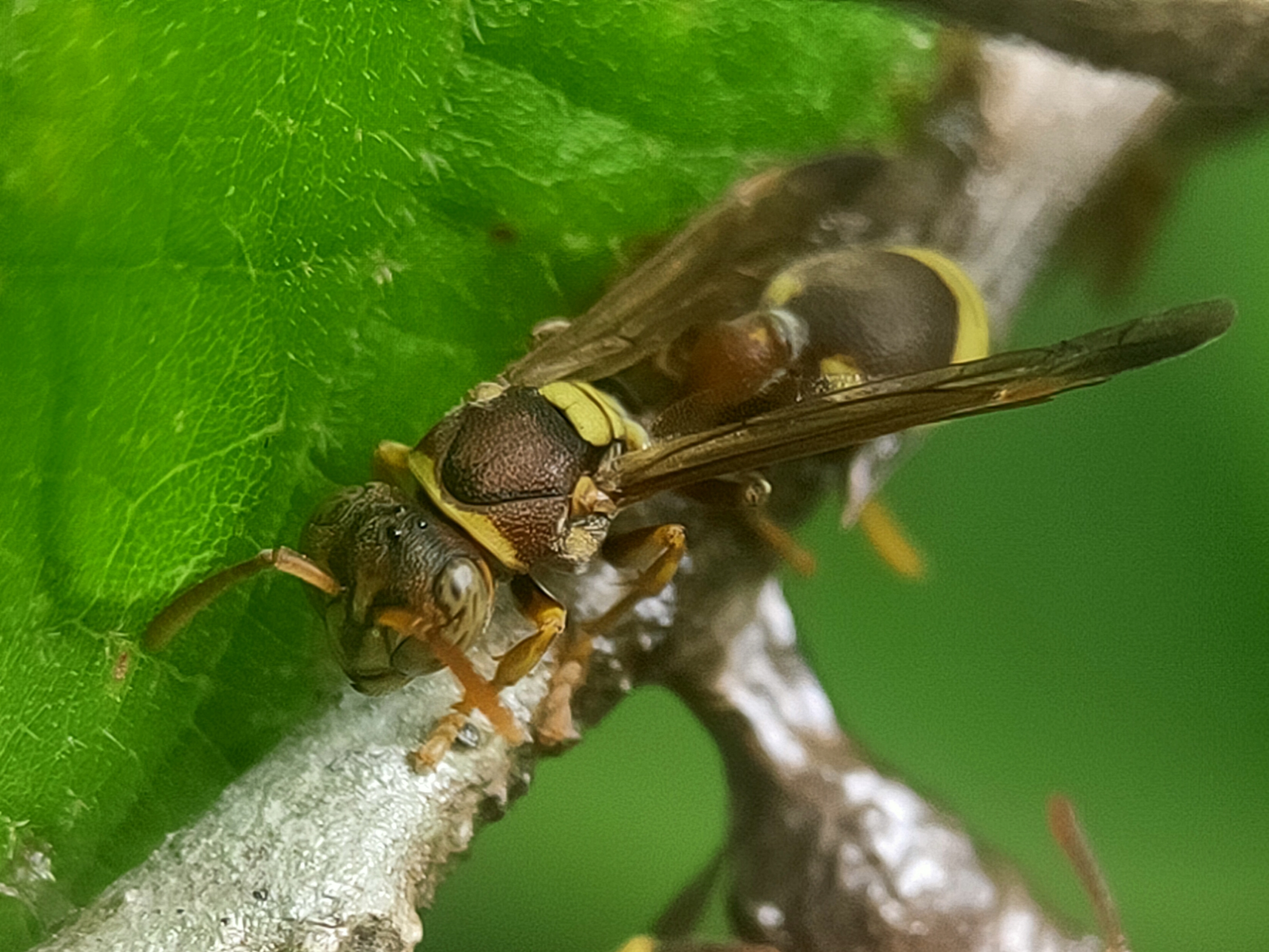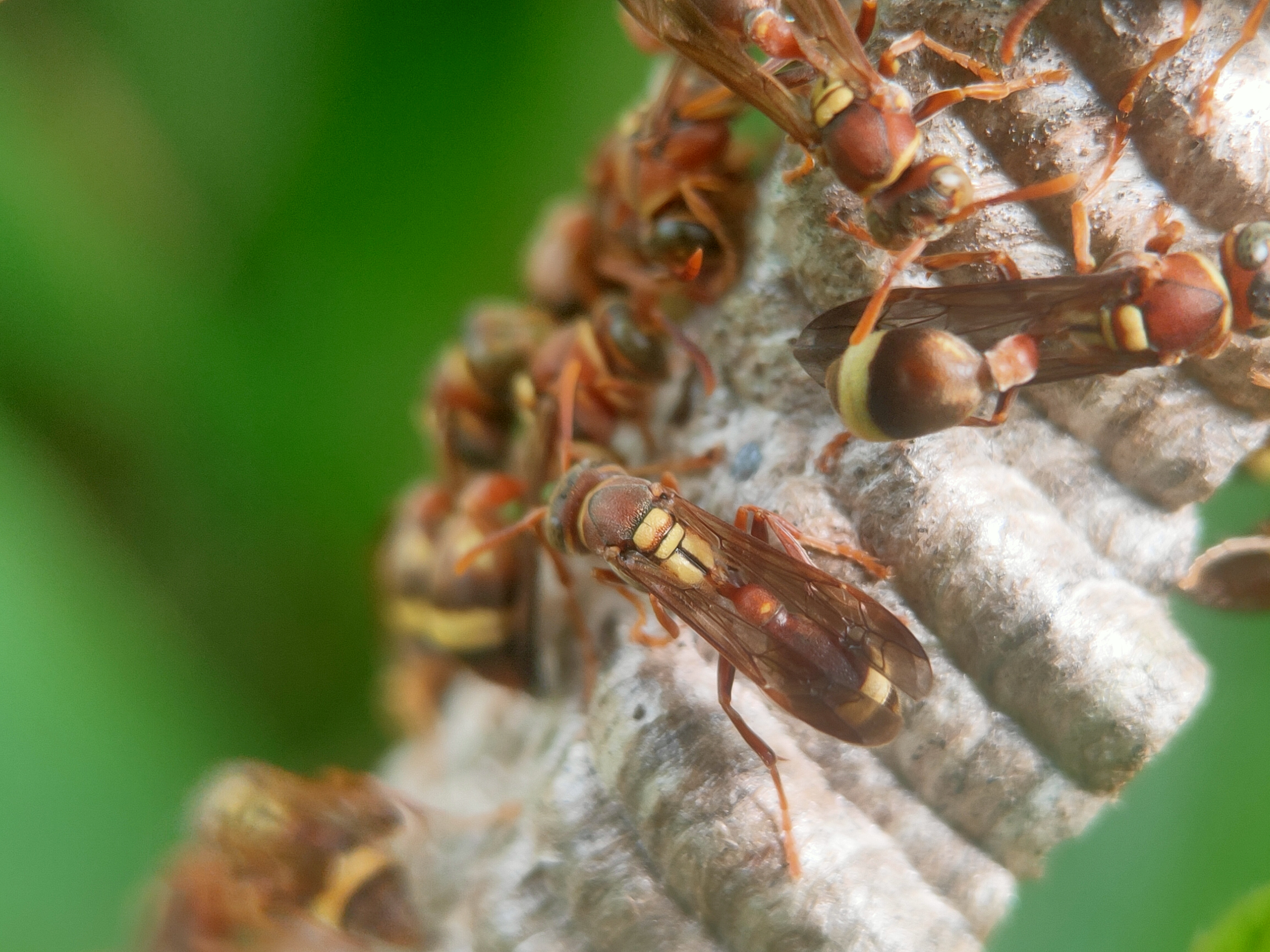 Today I share a photo of a paper wasp, this wasp produces fibers from wood that are mixed with saliva, then form a nest. I was very careful when photographing them, because I was afraid they would realize then they could attack me. And below I have uploaded a photo of them that I found in the forest.