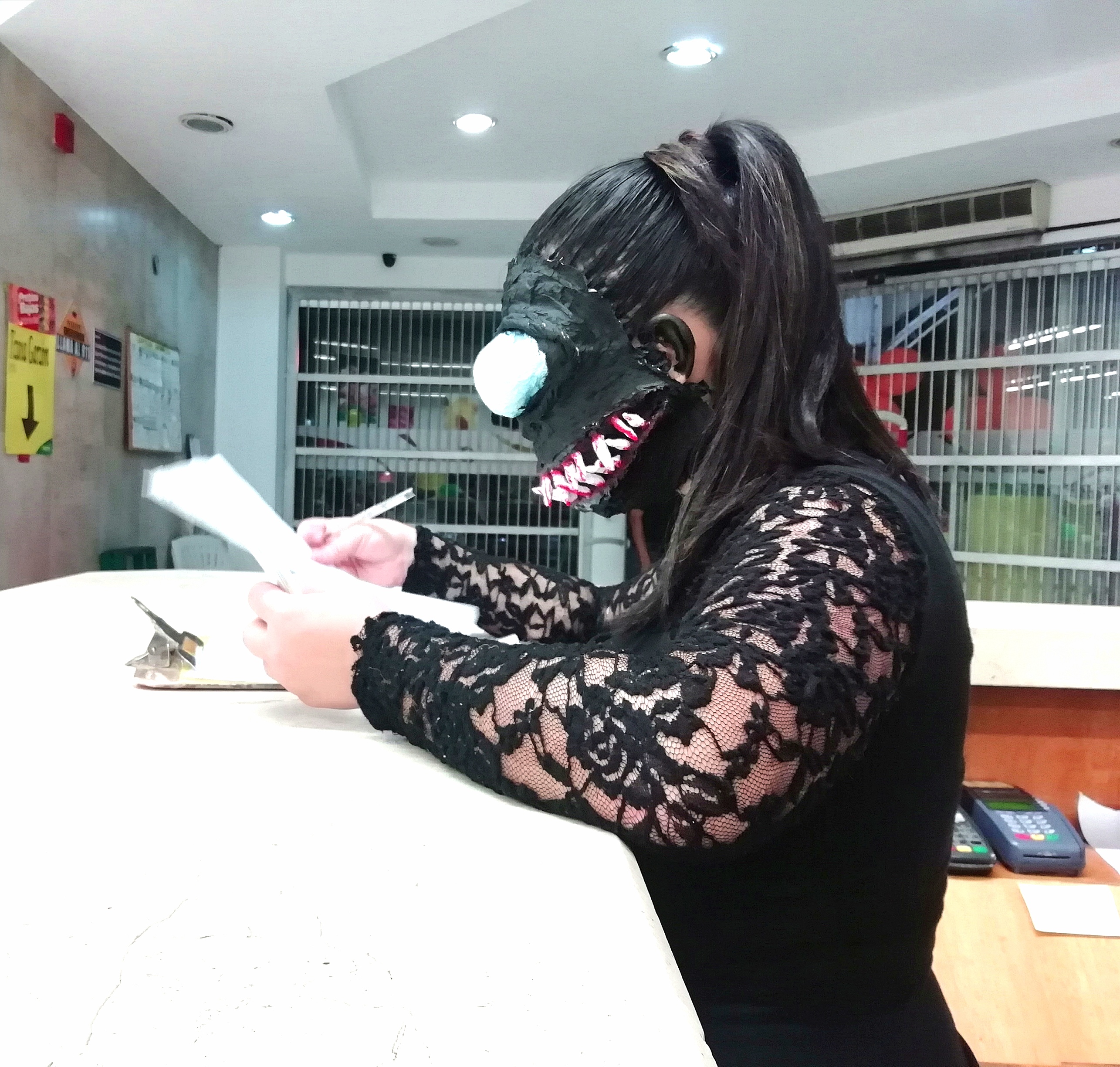 La capture ya al final de la jornada laboral, mi compañera de trabajo estaba haciendo unas anotaciones de los cierres finales y yo estaba terminando de ordenar todo, pero fue tan genial la vista, q no pude dejar pasar esta oportunidad y capture la imagen sin q ella se diera cuenta, luego le mostré la fotografía y nos soltamos de risa, por lo divertida y impactante q quedó la imagen.