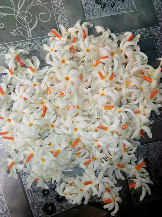 Nyctanthes arbor-tristis, the night-flowering jasmine or parijat, is a species of Nyctanthes native to South Asia and Southeast Asia. Nyctanthes arbor-tristis is a shrub or a small tree growing to 10 m tall, with flaky grey bark. The leaves are opposite, simple, 6–12 cm long and 2–6.5 cm broad, with an entire margin.