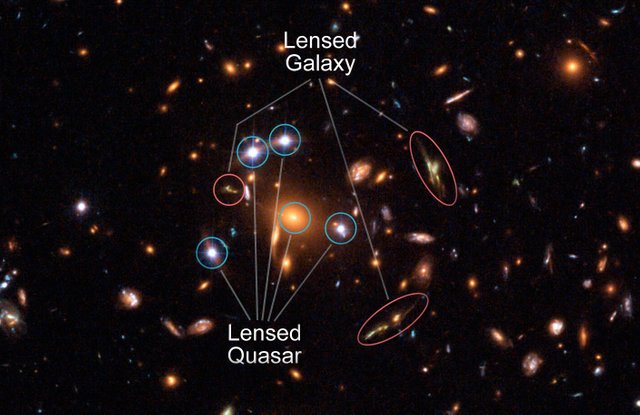 Here is a capture from the Hubble Space Telescope including gravitational lensing in several galaxies and quasars.