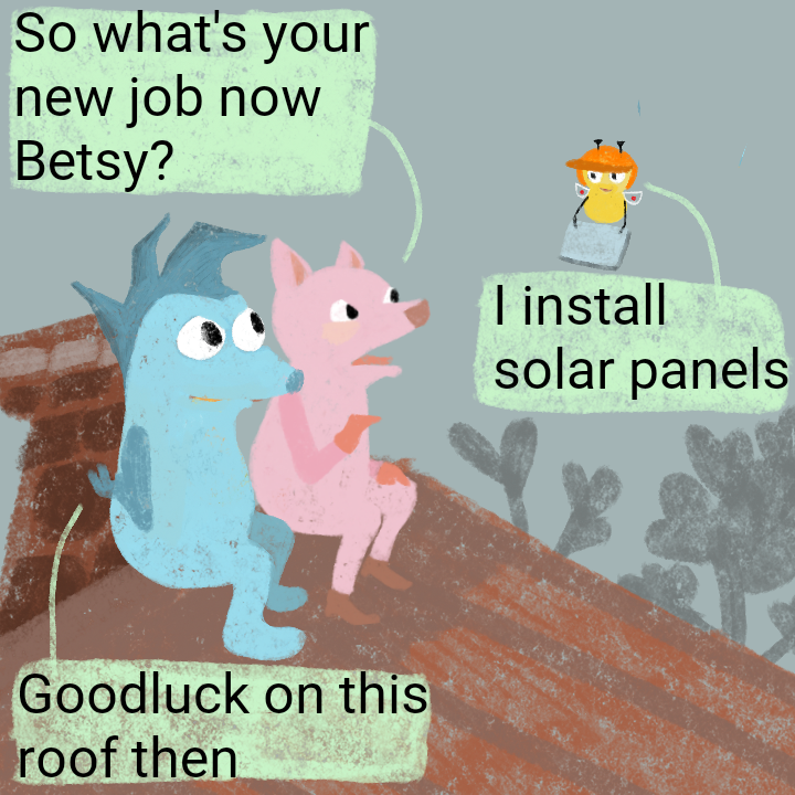 This is my participation in the Pinky and Spiky Drawing Contest by @organduo and @laputis. This week the theme is about alternate career. Betsy the butterfly could be the tiniest but the boldest to make a career move. Given the recent pandemic and lock down every creature in Browneartopia is forced to adapt and that includes looking for alternate careers. Pinky and Spiky are still debating about possible options but Betsy already found hers. Good luck on the size of the roof she'd be working on as a new solar panel installer. She would need a ton of luck and hard work. Hope you like it