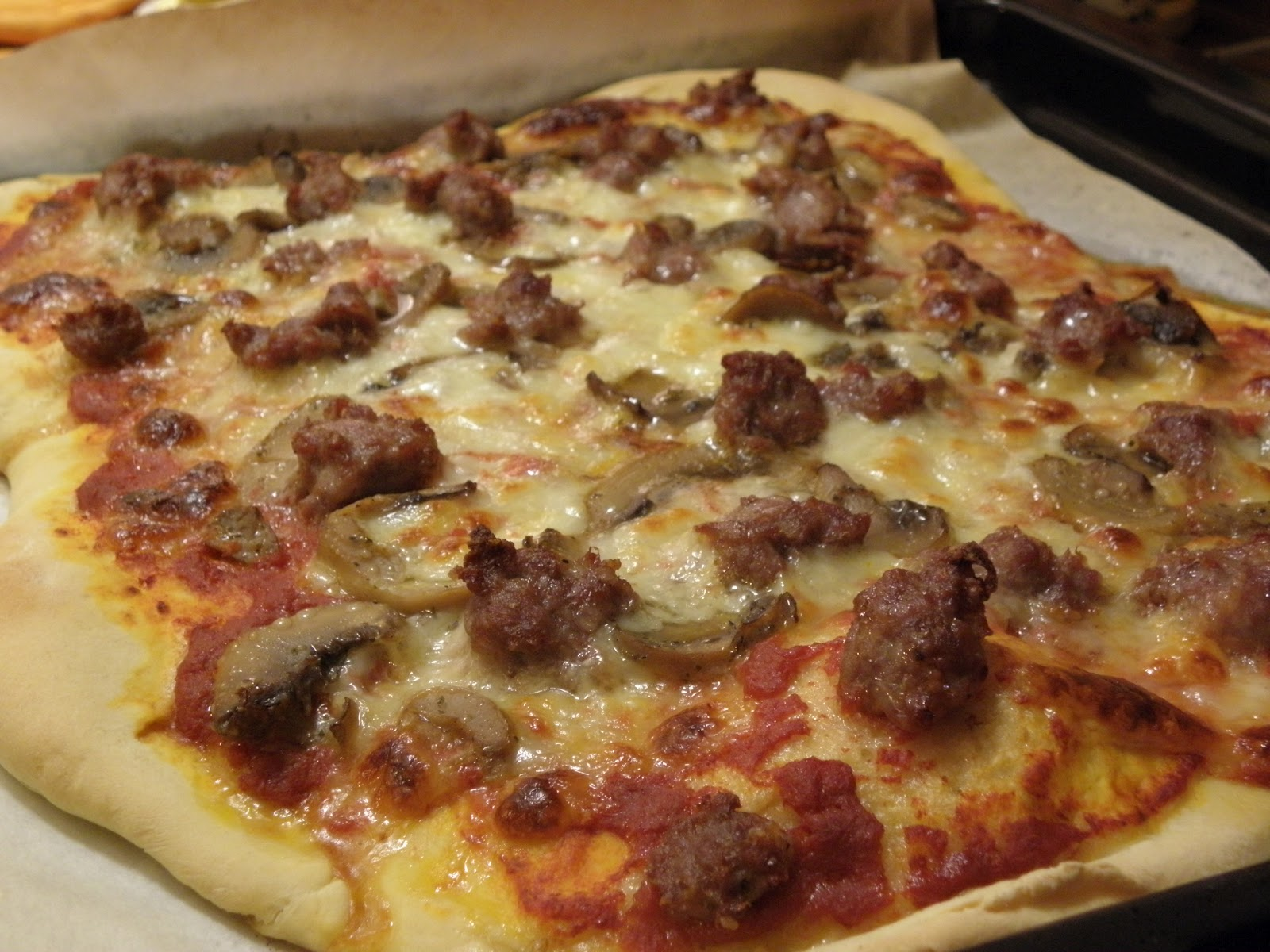 5 Funghi e salsiccia. Tomato, mozzarella, mushrooms and sausage.