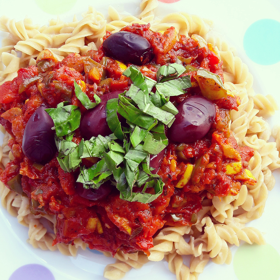 Świderki bezglutenowe z sosem pomidorowym z papryką i cukinią, oliwkami i posiekaną świeżą bazylią.