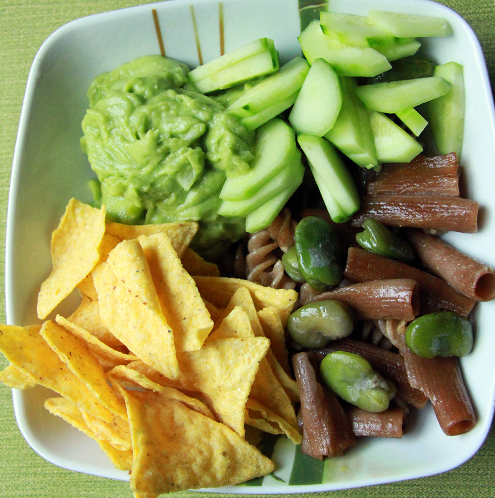 Tutaj wielka improwizacja, czyli coś z niczego: makaron gryczany wymieszany z oliwą i resztką bobu (z poprzedniego dnia), podany z ogórkiem, guacamole i kukurydzianymi tortillami