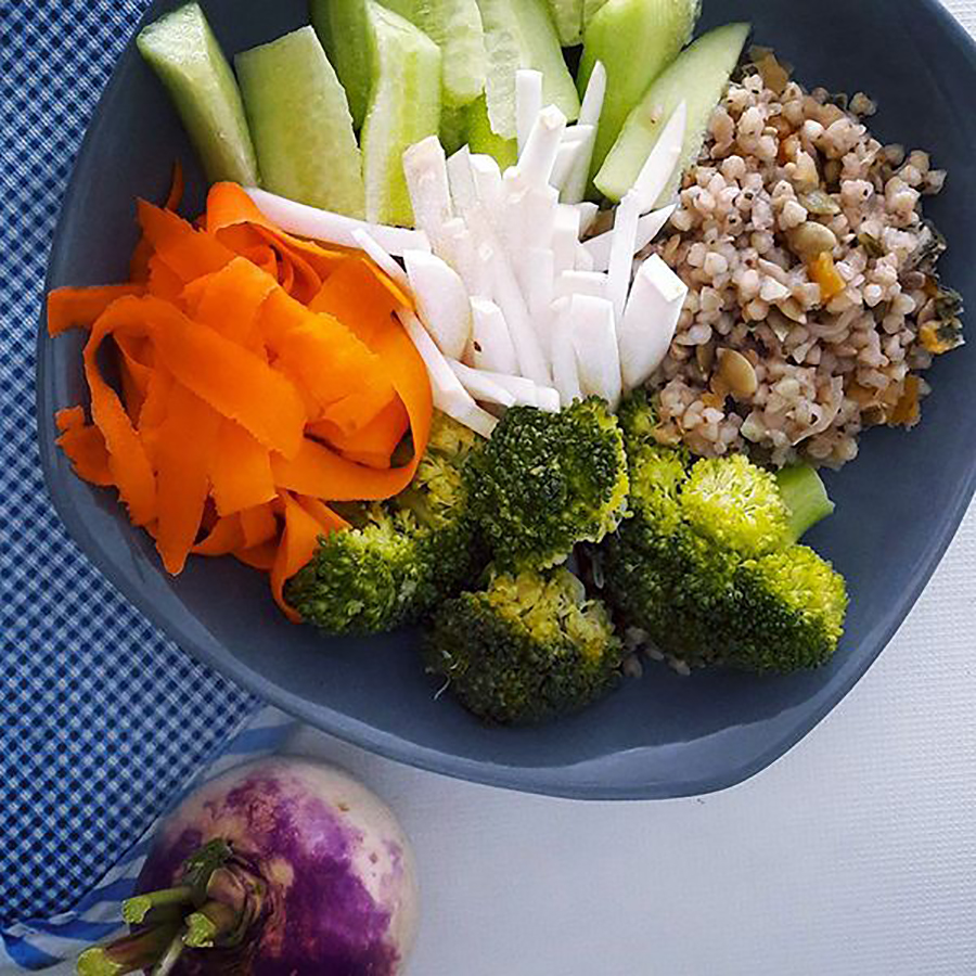 Kasza gryczana biała z pestkami dyni podana ze krojonymi warzywami, które tego dnia "były pod ręką" ( a raczej pod nożem :))
