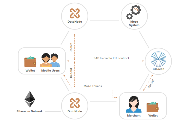 Mozo works with the use of "smart contract", which is associated with retail trade. This smart contract is established between a retail smartphone or an IoT device (such as Beacon) and a consumer smartphone, as they discover each other's device. A smartphone for smartphones and a retailer can receive and process a transaction at the customer's command. In other words, the Mozo contract is a transaction created by the user that passes control commands between a user device, user user, or user system. Therefore, we create an intellectual contract in which the object of an intellectual contract is the transaction processing in the chain network.