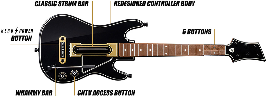 Do gry dołączana jest na nowo zaprojektowana gitara. Do grania służy nam 6 przycisków (3 czarne u góry i 3 na dole). Żeby wybić nutę, musimy przytrzymać ukazaną na ekranie kombinację przycisków i uderzyć do góry lub w dół tą czarną, plastikową belką która ma imitować struny.