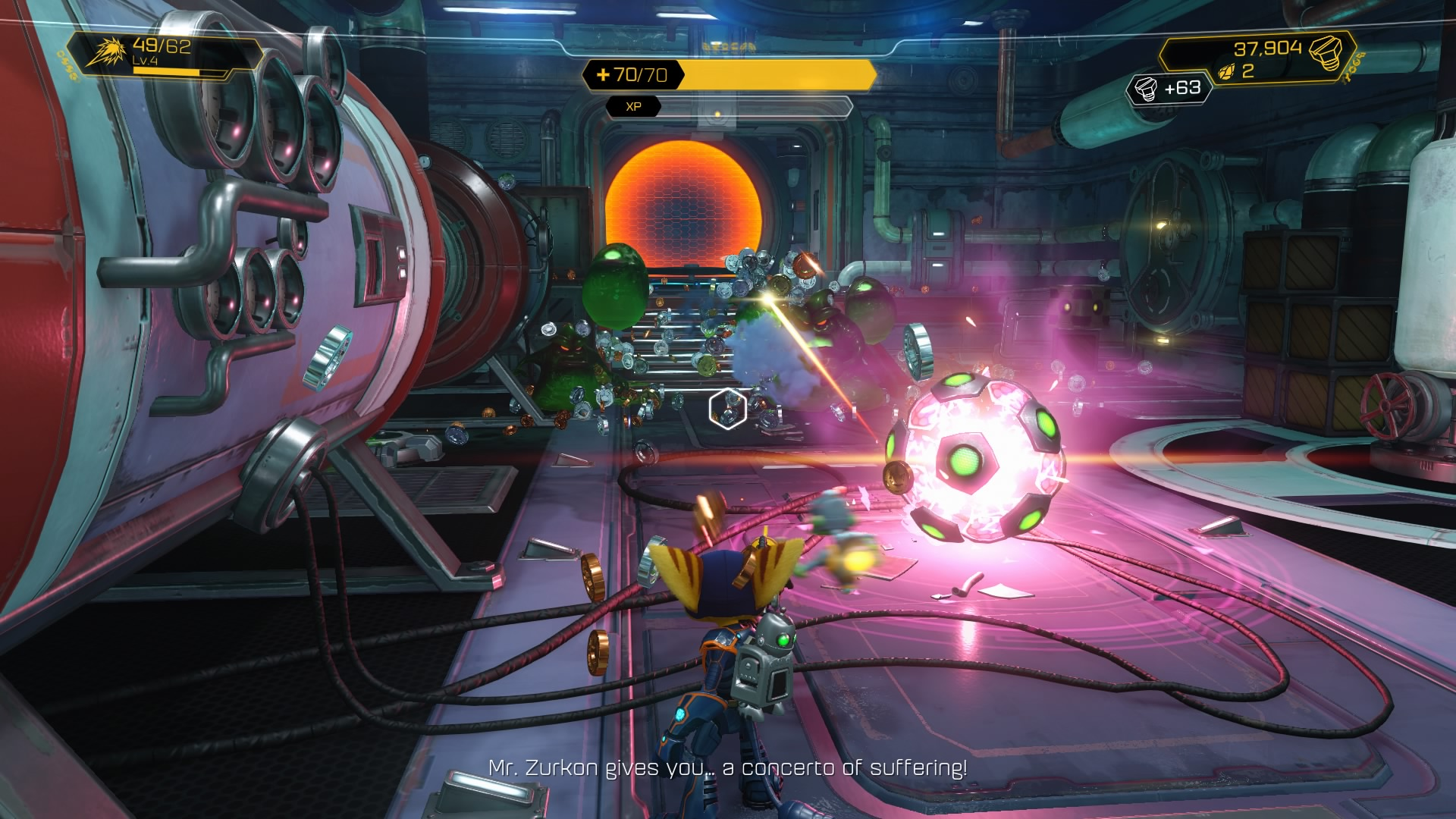 Ale są też prawdziwe perełki jak np. Bouncer, który wypluwa granat, który pulsuje w pewnej odległości od siebie zadając stałe obrażenia przeciwnikom wokół albo taka broń jak Pan Zurkon, który po aktywowaniu kręci się wokół naszego Lombaxa pilnując jego tyłów, przy okazji rzucając jakieś zabawne tekściki.