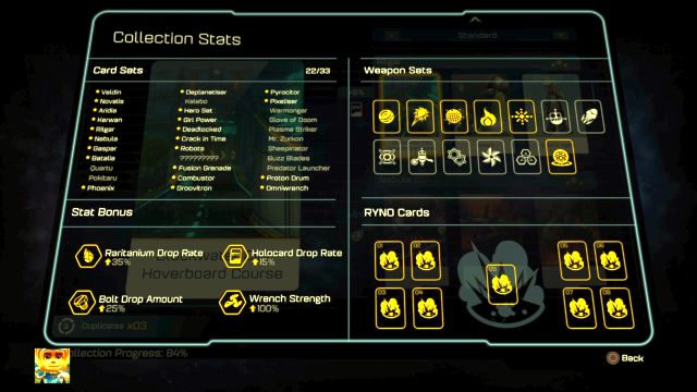 Do zbierania mamy jak zwykle złote śruby (nie spełniają żadnej funkcji oprócz trofea i odblokowania sekretów) oraz karty, które dają nam różne bonusy np. do śrubek. Mamy do zebrania karty RYNO, gdy skompletujemy komplet możemy odebrać tą broń, która jest (jak w każdej części) najmocniejszą bronią, więc chyba warto.