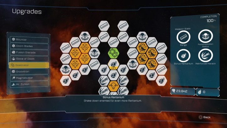 Wszystkie bronie są uber kozackie, mamy ich naprawdę sporo i każda ma o ile pamiętam albo 8, albo 10 poziomów ulepszeń. Do tego w grę wchodzą ulepszenia za rarytarium, które dają nam boost procentowy do np. zasięgu broni albo do jej szybkostrzelności itd.