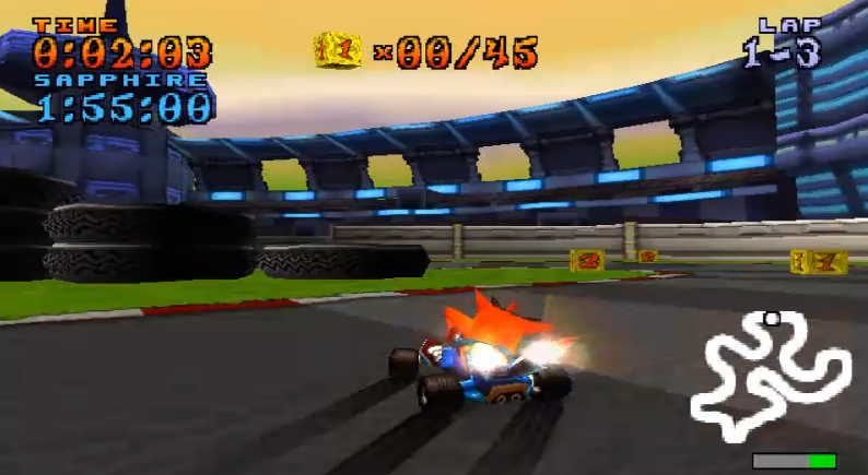CTR to w skrócie wyścigi gokarcikami w oprawie graficznej znanej z serii z Jamrajem. Gramy zawsze w 8-osobowych starciach, podnosimy bronie no i głównym zadaniem jest zdobyć pierwsze miejsce, wiadomo.