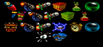 Na mapach mamy porozrzucane skrzynki z losowymi brońmi, paski turbodoładowania oraz owoce Wumpa (zebranie ich 10 podczas wyścigu odblokowuje nam mocniejsze wersje standardowych broni ze skrzynek).