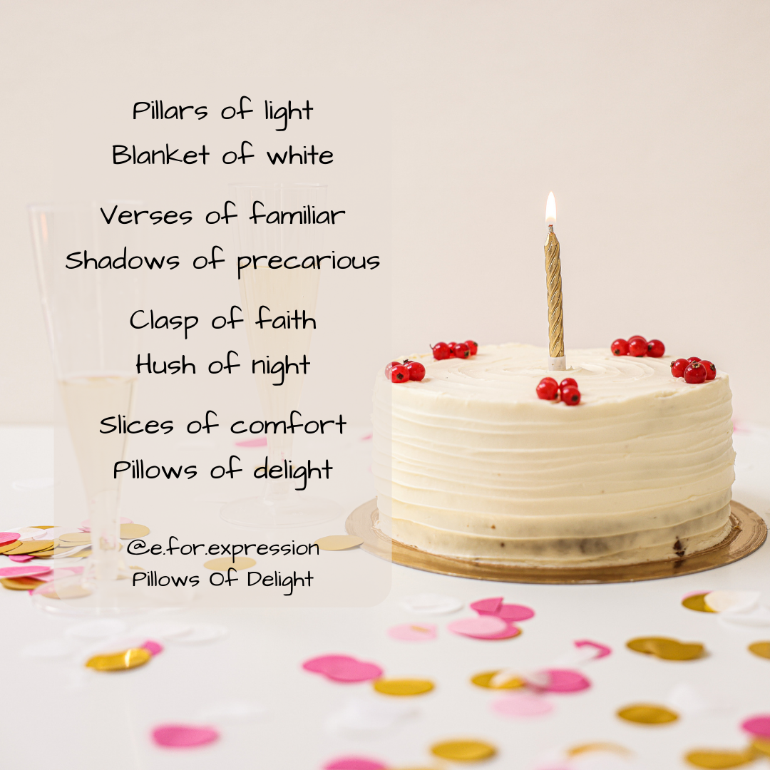 Pillows Of Delightawesome1oo (33)in #poem • 4 years ago Pillars of light Blanket of white Verses of familiar Shadows of precarious Clasp of faith Hush of night Slices of comfort Pillows of delight #poetry #delight #pillow #night #cake #faith #light