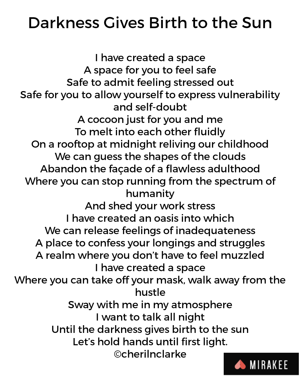 Darkness Gives Birth to the Suncclarke (39)in #poem • 6 years ago It has been such a long time since I've posted on Steemit! I'm back now, and ready to share more of my creative works. Below is a poem entitled "Darkness Gives Birth to the Sun." More of my work can be found on Instagram @cheril.n.clarke. #poetry #spokenword #poet