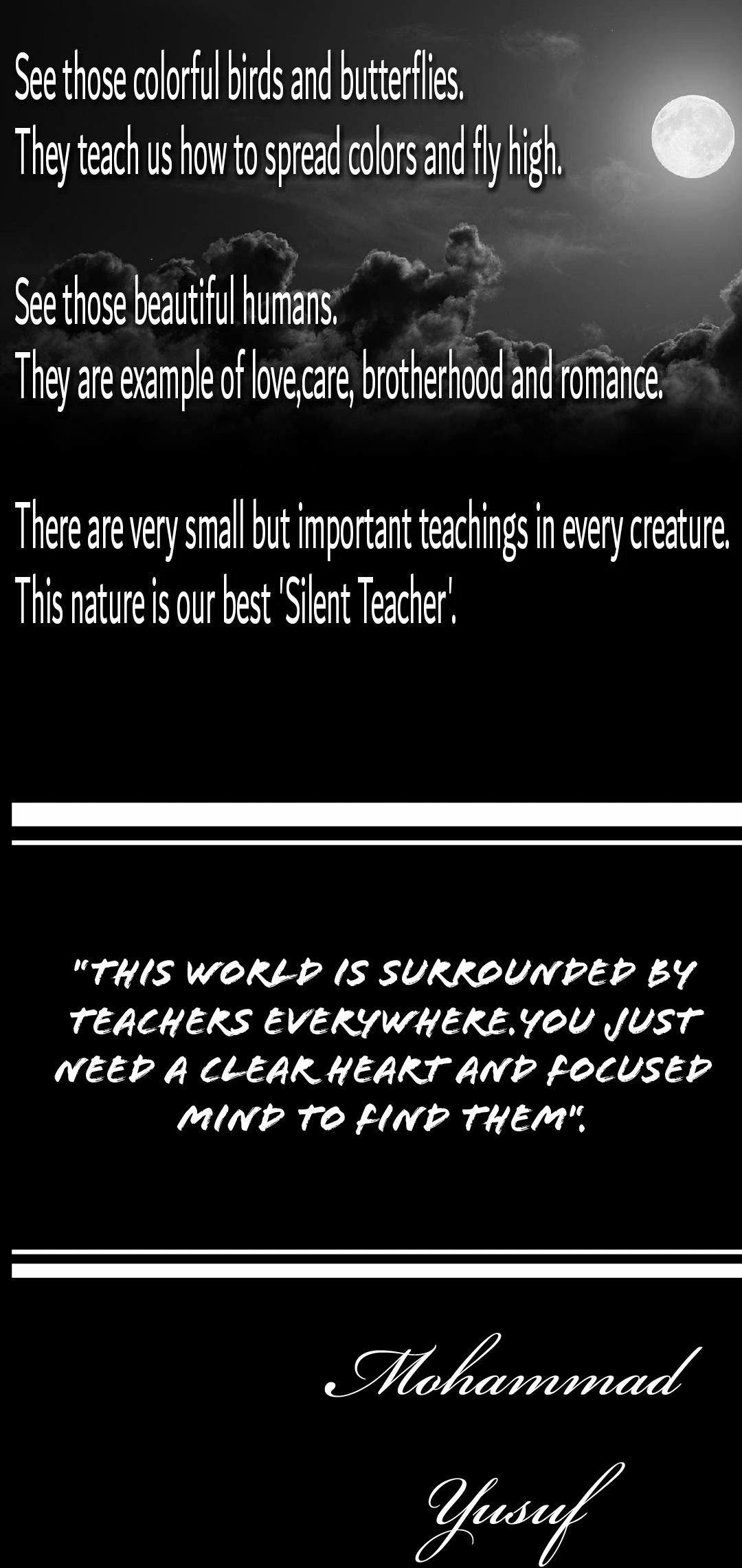 Hello steemians, I am back with my new poem. This poem is based on very serious and important teachings of nature and environment. In this poem I have tried to point out the teachings of the nature. Please read and give your views.
