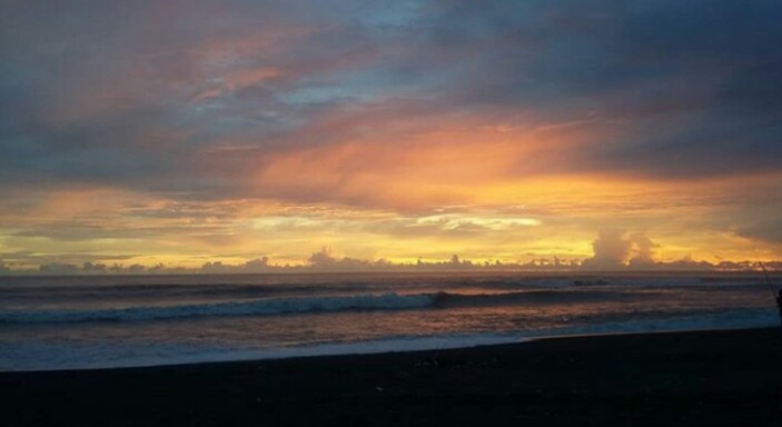 Keindah ombak yang menabrak pasir tidak mau kalah dengan keindahan warna jingga bayu yang turukir indah di langit. Ombak laut terus berhembus bersama angin berlari surut di teluk pantai, seolah-olah warna jinga langgit dan ombak laut saling menampakan keindahannya kepada penonton.