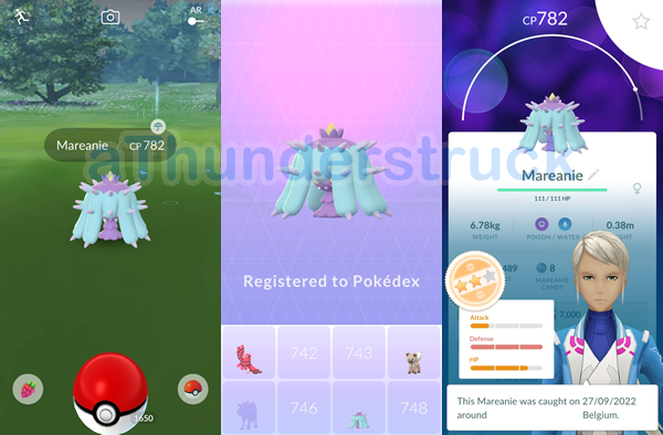 Here is a screenshot of my first Mareanie encounter and my Mareanie Pokédex registry.