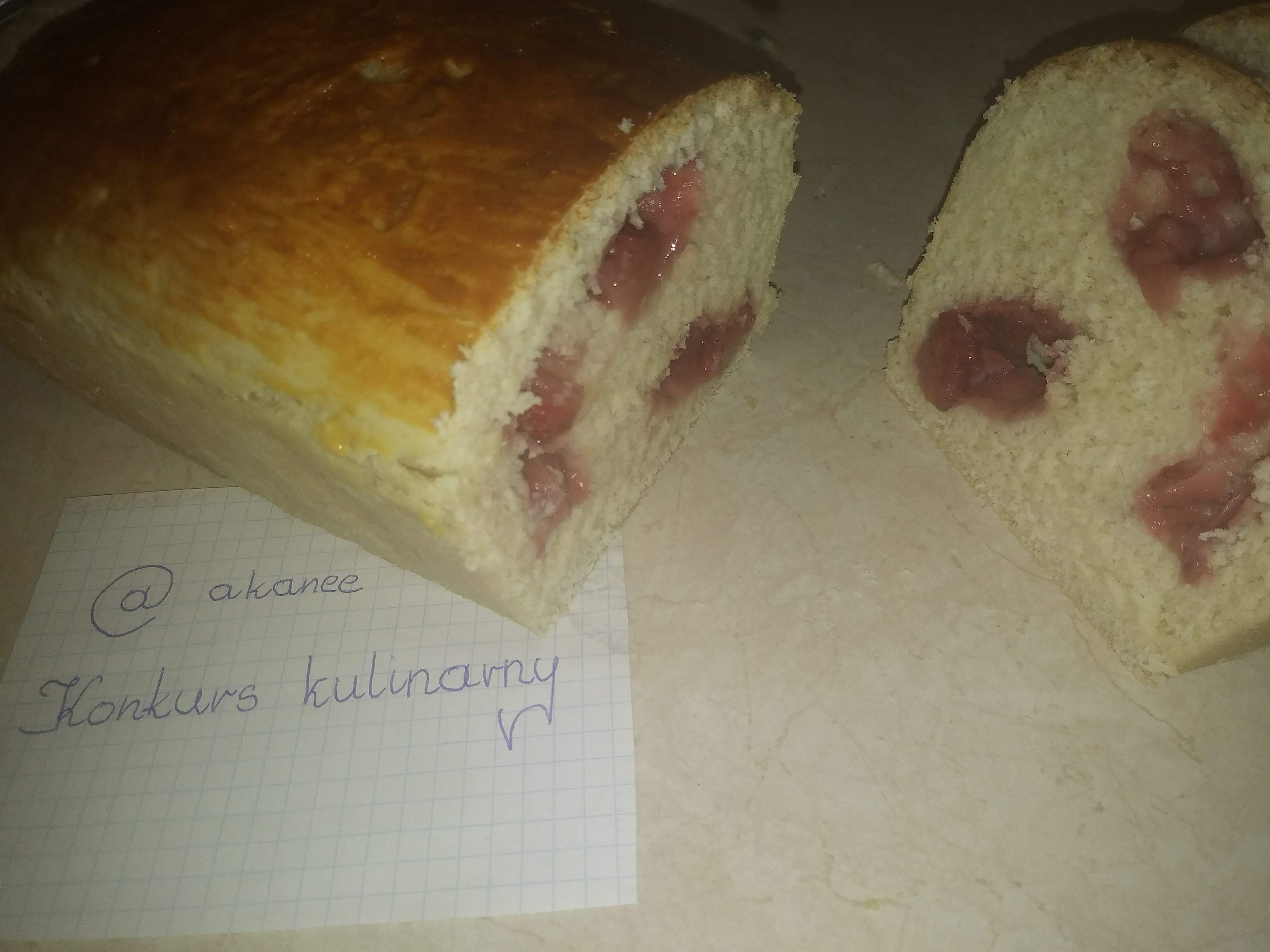 Chleb w wersji na słodko (mimo tematu konkursu musiałam dodać od siebie coś, co połączy chleb i moje ukochane cukiernictwo). Ów chlebek pierwotnie miał być chlebkiem bananowym. Obmyślając już plan działania, przyszło mi do głowy, że skoro mamy czas, w którym królują truskawki szkoda nie wykorzystać właśnie ich. Chleb truskawkowy, więc po prostu truskawki zamiast bananów! Do tego dorzuciłam swoje zainteresowanie Japonią, przypominając sobie jak chleb robią Japończycy. Tak nastąpiła „mała” zmiana planów. Japoński chleb, chleb mleczny. Jako dodatek ode mnie — truskawki.