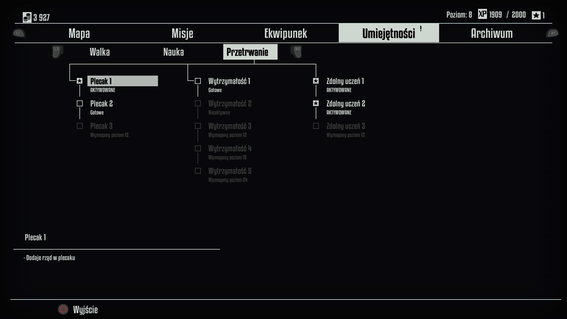 W ostatnim dziale Przetrwanie umieszczono trzy perki: Plecak dający maksymalnie 9 nowych miejsc w ekwipunku. Druga jest Wytrzymałość dająca odporność na obrażenia. Na początku stalowe poczwary są dla nas śmiertelnym zagrożeniem, ale potem jesteśmy niczym Superman, dlatego pod koniec gry zwiększyyłem poziom trudności, bo... robiło się za łatwo. Trzecią zdolnością jest Zdolny Uczeń pozwalający na zdobywanie większej liczby punktów doświadczenia i szybsze levelowanie postaci.