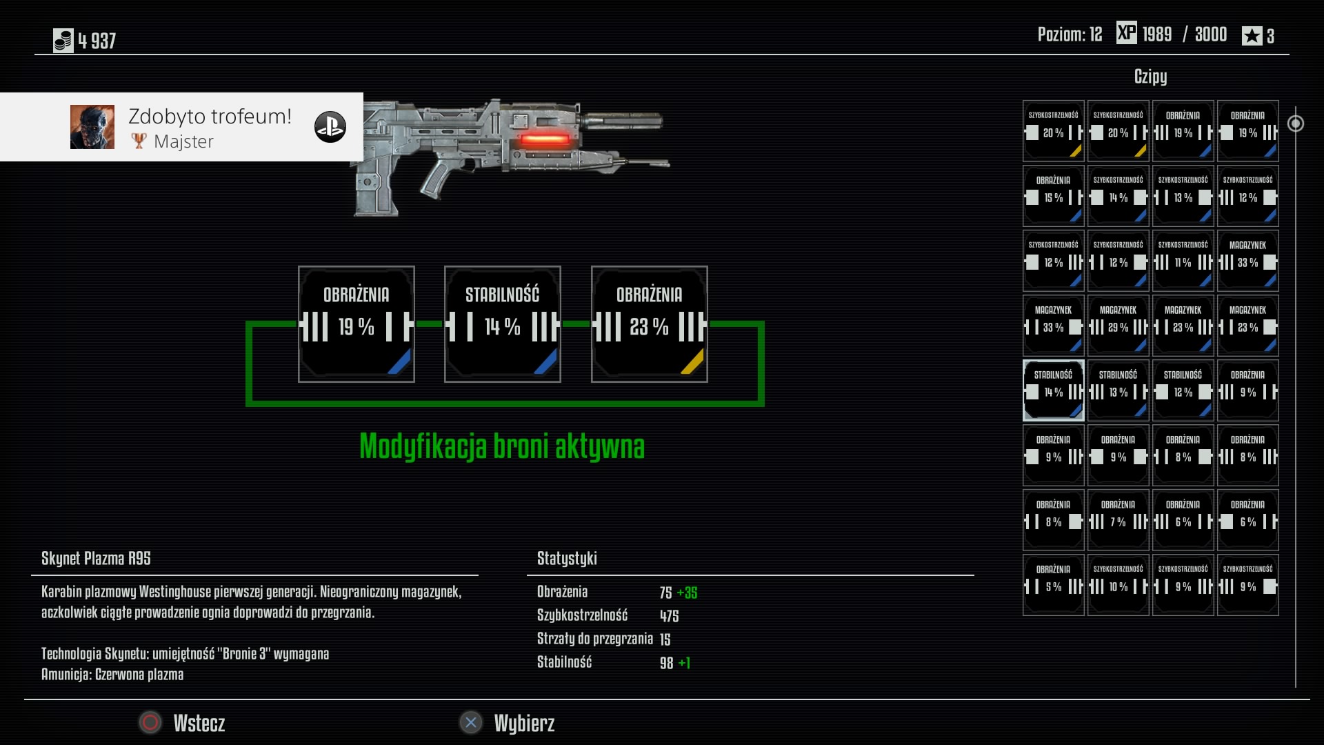 Ponadto także będziemy mogli ulepszać broń plazmową (jeśli się nauczymy jak). Ulepszanie broni plazmowej polega na umieszczaniu odpowiednich chipów, które możemy lootować (zbierać) z zabitych maszyn. Polega to na swego rodzaju grze logicznej, z którą by sobie poradziła średniorozgarnięta małpa. Będziemy musieli umieścić chipy tak, aby zamknąć układ (żeby połączenie między tymi gniazdami zaświeciło się na zielono). Żeby zamknąć układ musimy układać chipy tak, aby pasowały do siebie symbole po obu stronach chipu. Każdy chip ma po trzy symbole po prawej, jak i po lewej stronie. Mogą to być : zwykły gruby pionowy prostokąt, dwie pionowe kreski, lub trzy pionowe kreski. Rzeczywiście skomplikowane do ułożenia. Ponadto chipy mają oznaczenia kolorowe, charakterystyczne dla klas przedmiotów w wielu grach RPG : siwe (najsłabsze), zielone, niebieskie, purpurowe (fioletowe) i żółte (złote - najlepsze). Oczywiście możemy łączyć chipy różnych klas. Dodają one dodatkowe atrybuty do broni plazmowej, takie jak : więcej obrażeń, większy magazynek, większą stabilność przy odrzucie, zwiększoną szybkostrzelność, itd... Ja to przeważnie szedłem w zwiększanie obrażeń.