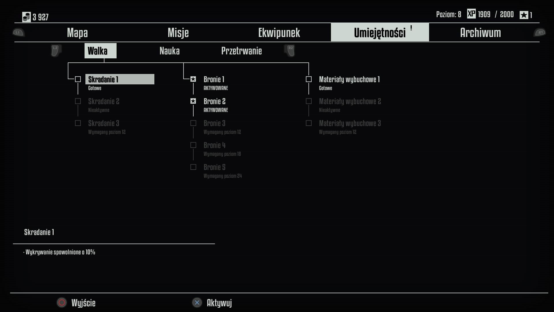 W pierwszej grupie Walka umieszczono trzy umiejętności : Skradanie, które sprawia, że wrogowie gorzej nas słyszą, ale moim zdaniem to powinno być w dziale Przetrwanie, a zamiast skradania mogli dać Broń Energetyczną. Następne są Bronie, które pozwalają zadawać więcej obrażeń, a od 3 poziomu umiejętności możemy posługiwać się bronią plazmową. Trzecie są Materiały Wybuchowe, które pozwalają zadawać więcej obrażeń przy wybuchach.