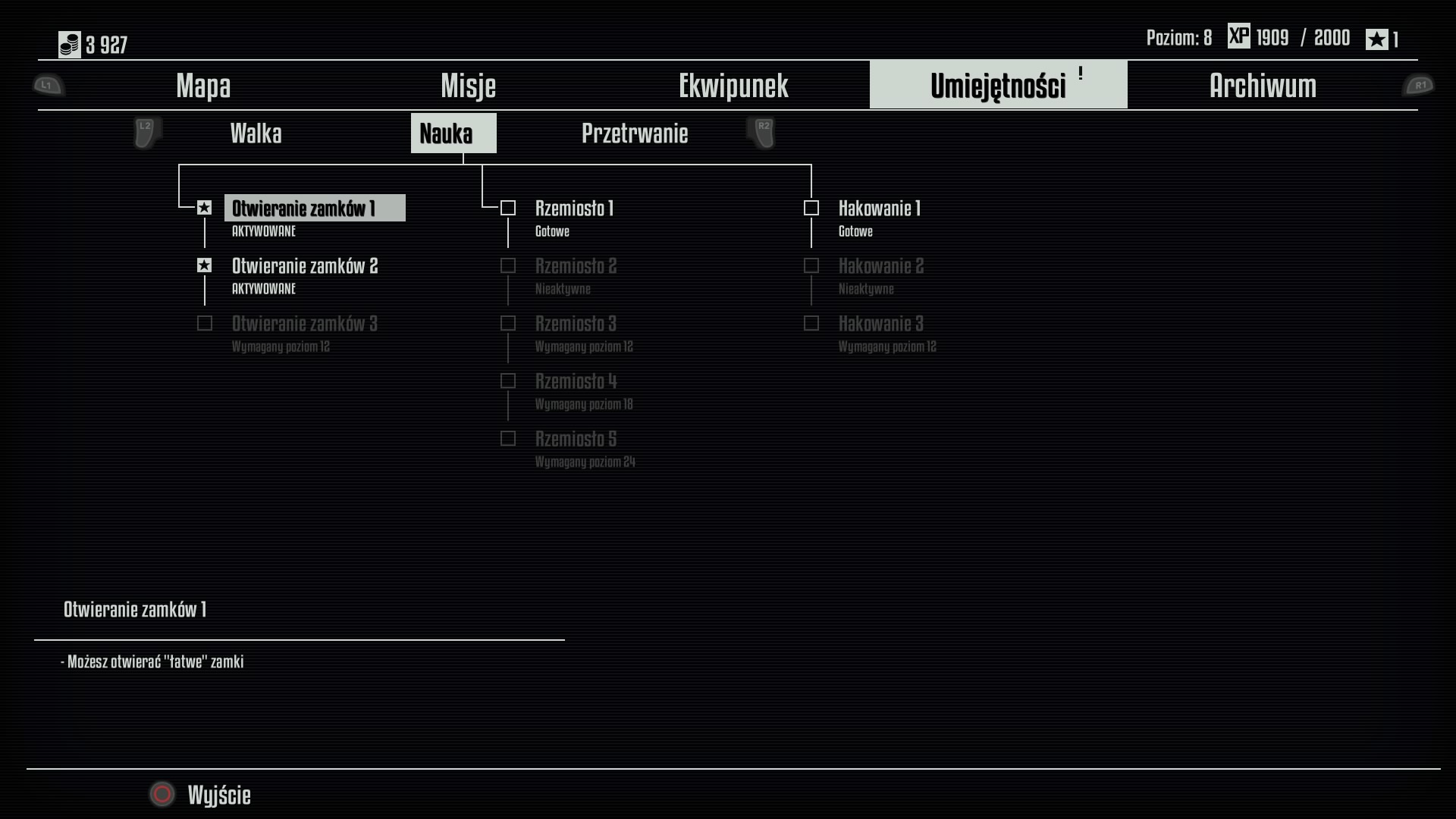 W drugiej grupie Nauka mamy trzy umiejętności: Otwieranie Zamków to chyba wiadomo. Drugie jest Rzemiosło, które pozwala wytwarzać przy warsztatach lepszy sprzęt i Hakowanie, które umożliwia otwieranie skrzyń Skynetu z amunicją i częściami, czy też przejmowanie kontroli nad wieżyczkami obronnymi Skynetu, czy też otwieranie zamkniętych drzwi do posterunkoów Skynetu.