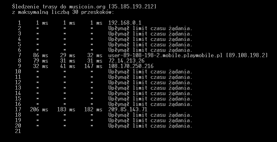Widać że ruch leci conajmniej do Stanów (odpowiada IP 209.85.143.71 z USA, należące do Google) więc prawdopodobnie to nie jest blokada po stronie Play, bo wtedy ruch sieciowy nie dotarł by już do USA. Już bardziej prawdopodobne, że strona musicoin/ich serwer nałożył jakąś blokadę na niektóre lub wszystkie pule adresowe Play. Czasami jakiś automat może blokować, bo wykrywa że z określonych adresów IP jakieś ataki na nich są kierowane, a może to jakieś problemy techniczne, a może problemy gdzieś w routingu sieci. Wiele jest opcji.