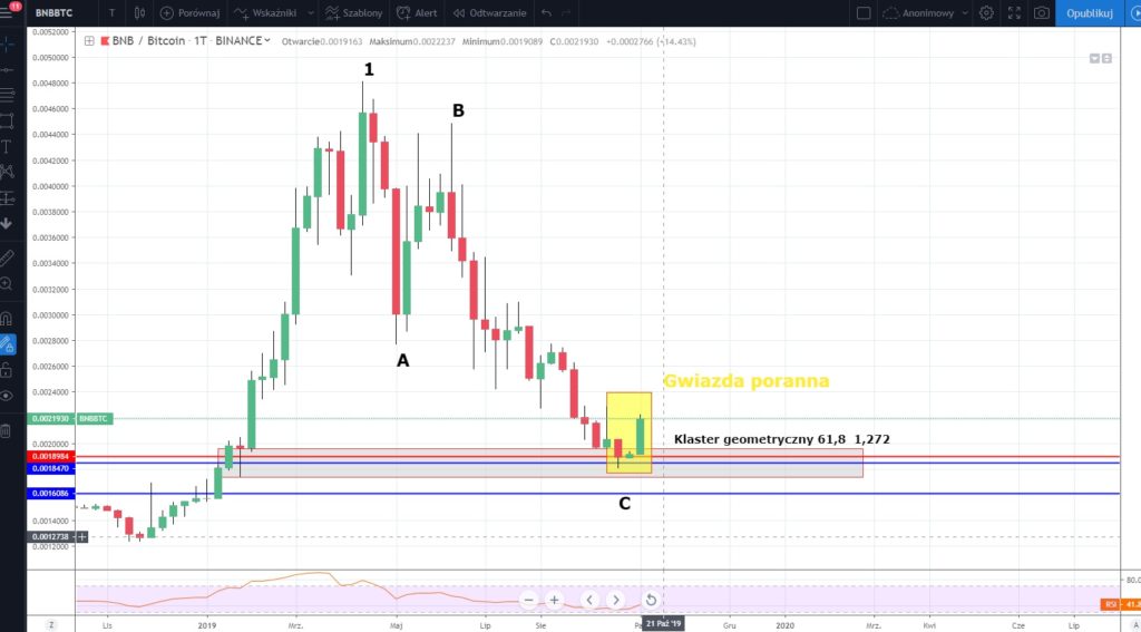 To nie koniec analizy BNB, żeby potwierdzać rozpoczynające się wzrosty przeanalizujmy parę BNBBTC, bo przecież logiczne jest, że jeśli cena BNB miała by rosnąć a BTC spadać to na wykresie BNBBTC też powinniśmy mieć ładną strukturę zapowiadającą wzrosty. Na wykresie oznaczyłem wzorową korektę prostą (ABC) z idealnym zakończaniem na klastrze geometrycznym, potwierdzoną formacją wzrostów w mocnym interwale tygodniowym. Co prawda nadal brakuje overbalanceu fali C a jednak mam już 80-90 % przekonania, że Binance coin zdominuje swoim udziałem BTC. Gdybym się mylił, cena testując oznaczoną formację mogła by dojechać do kolejnego poziomu zatrzymania korekty – 66,7 oznaczonego niższą linią niebieską. Tam uznałbym drugie miejsce do zakupu BNB za BTC. Trochę niżej znajduje się poziom 70,7 którego osiągnięcie zniszczyło by moją analizę. Na razie jednak nic nie wskazuje, żeby ten negatywny scenariusz mógł się zrealizować. A więc ….. :):):)