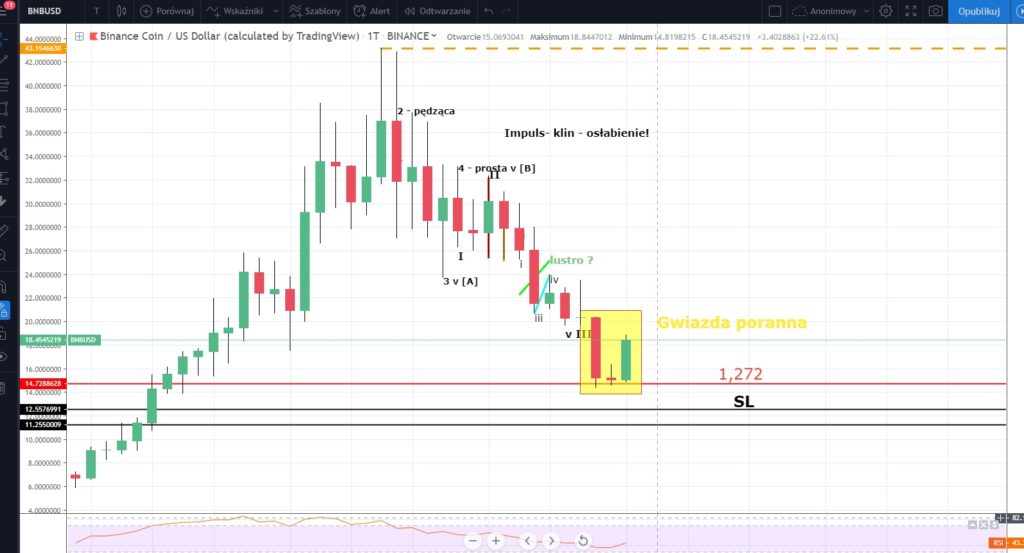 Binance Coin to obecnie mój faworyt w wyścigach. Kto widział poprzednie analizy wie, że oczekuję fali trzeciej wyższego rzędu 🙂 I choć wyznaczony przeze mnie klaster nie zatrzymał ceny, to udało się tego dokonać kolejnemu z poziomów zatrzymania trwającej korekty. BNB będąc nieco zależnym od ruchów związanych z BTC wyrysował przepiękną formację gwiazdy porannej na interwale tygodniowym. Jako, że stało się to idealnie na poziomie 1,272 Fali C kończącej korektę pędzącą całej fali drugiej. Mogę uznać , że zaczyna nam się duuuuuuża trójka wzrostowa. PS: w tym miejscu muszę dodać, że osobiście zmobilizowałem się do założenia konta na giełdzie Binance i już poczyniłem swoje zakupy w okolicach 15-17 USD. Jako mądry i świadomy inwestor utrzymuje Stop Loss na poziomie ok 12.5 USD i taką stratę dopuszczam na swoim kapitale. Gdybym nie zdążył zrobić Buy to poczekałbym na test owej formacji, który zawsze nadchodzi a jego minimum to 50% całego impulsu wzrostowego.